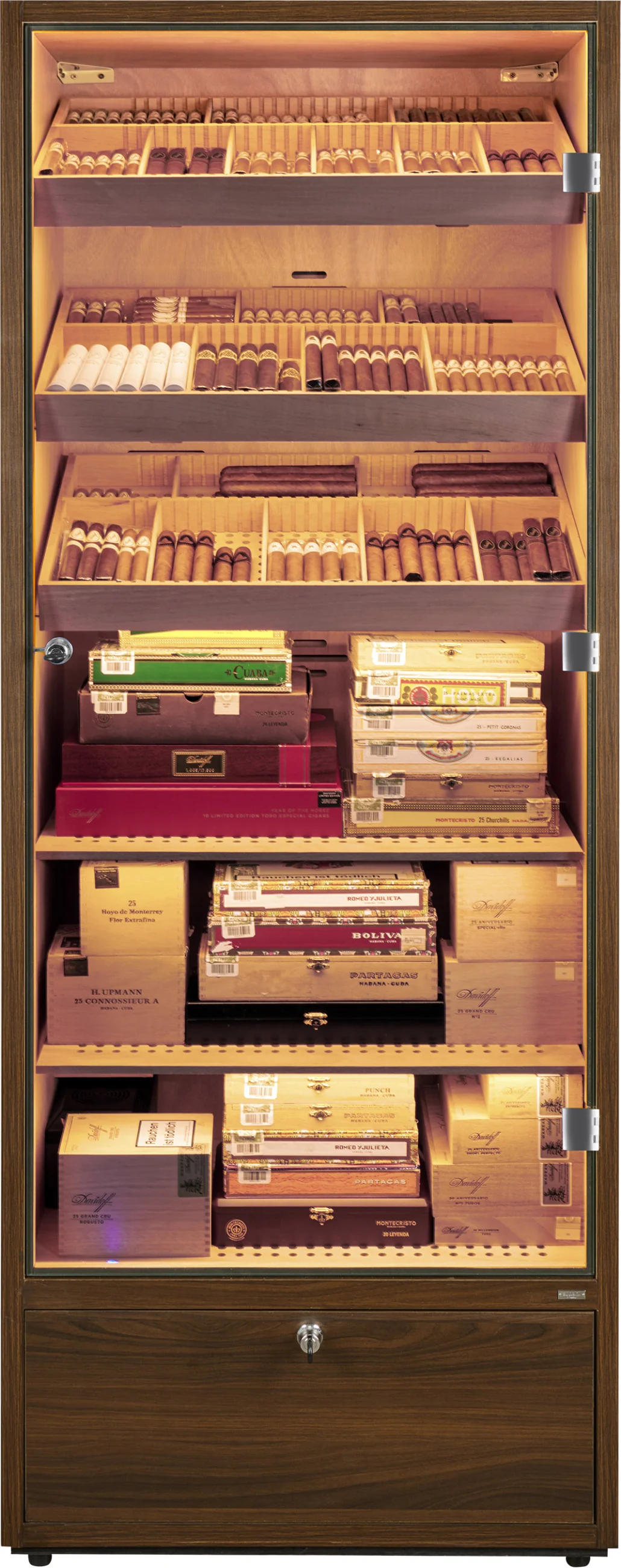 The humidor cabinet offers space for approximately 2800 cigars, calculated based on the classic Mareva format. Storage is designed for both individual cigars and entire boxes. The interior is divided into six levels and equipped with three trays and two shelves.