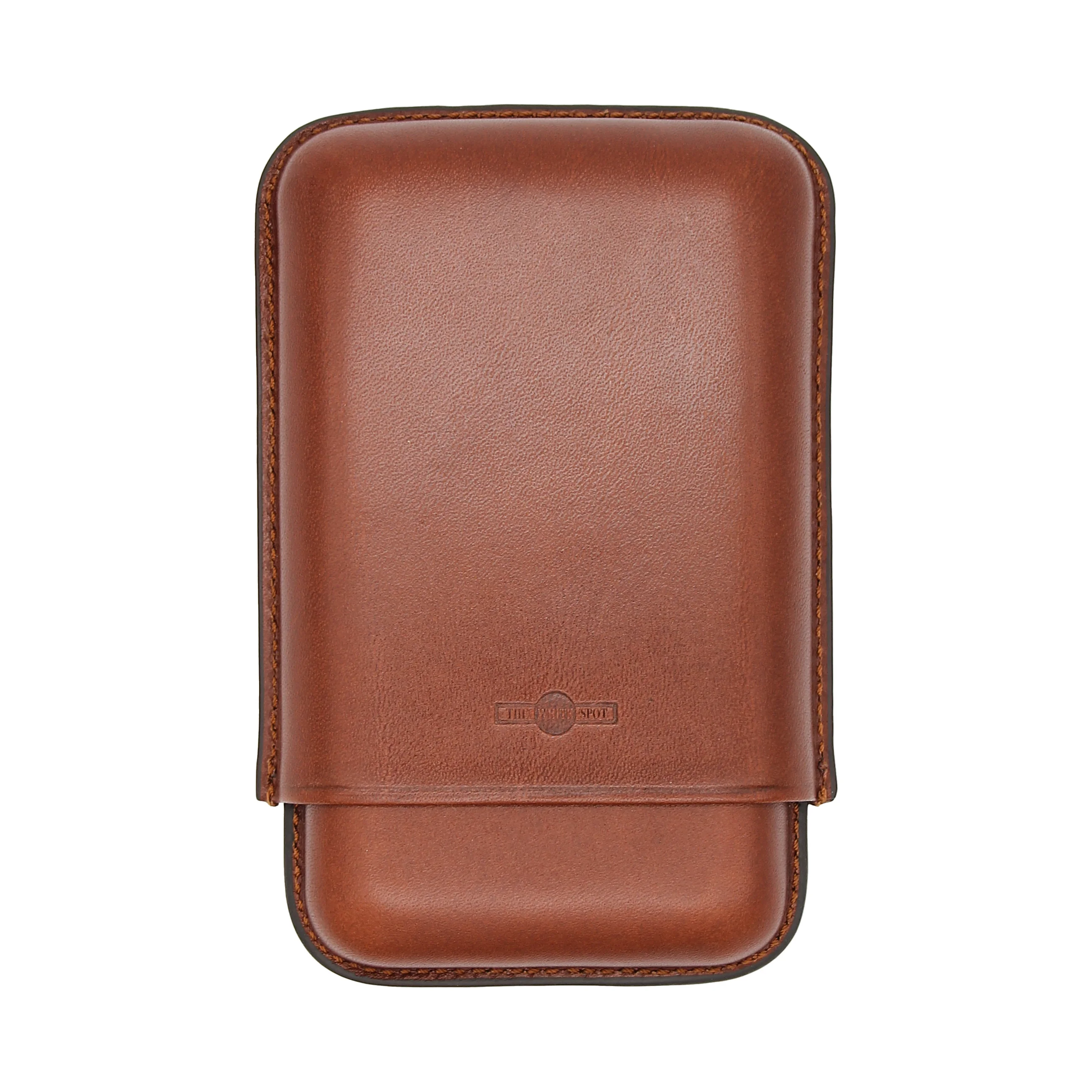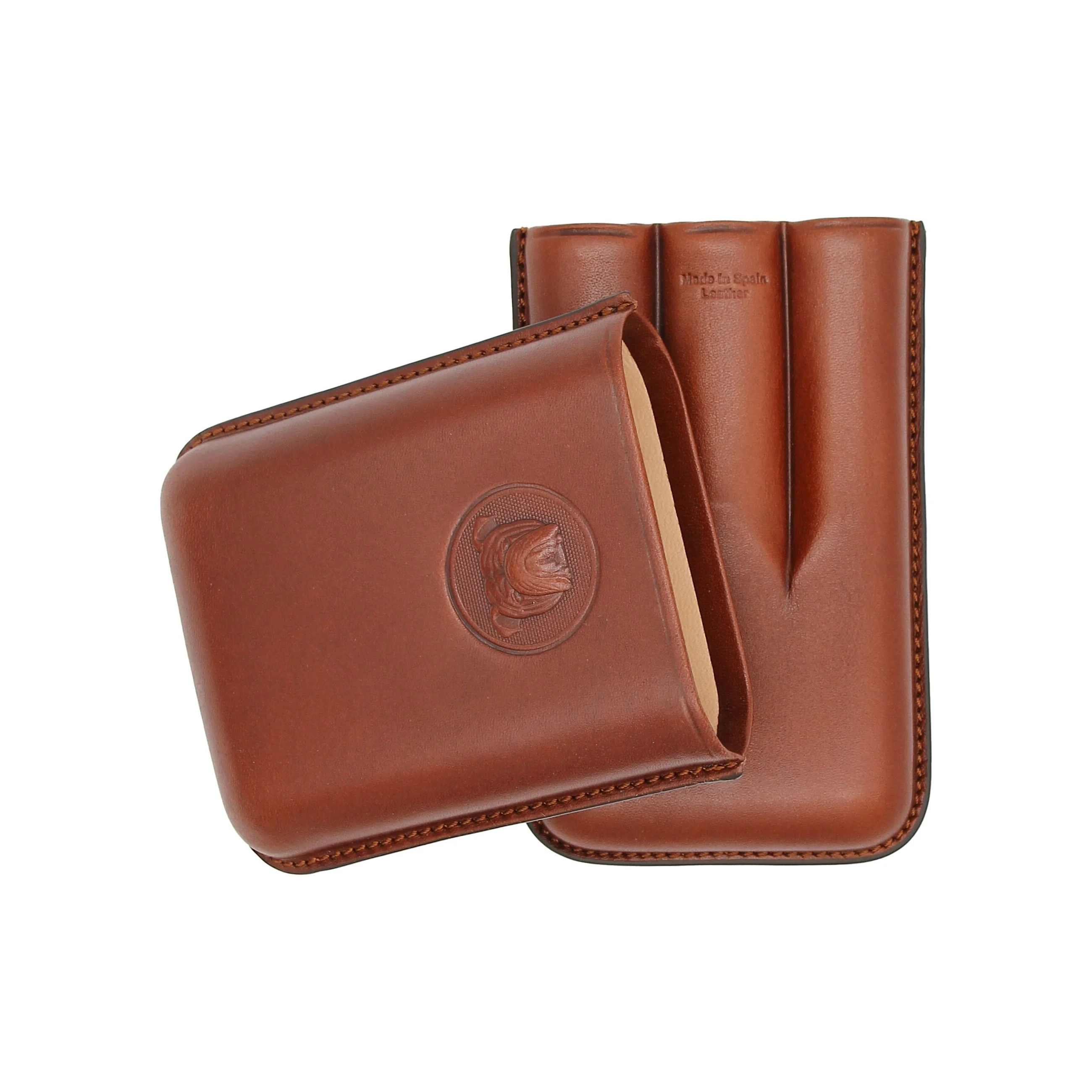 Inside, the case offers space for three cigars of different sizes. Practical notches ensure a secure hold during transport. The interior is lined with soft, light-colored leather, providing reliable protection for your cigars.