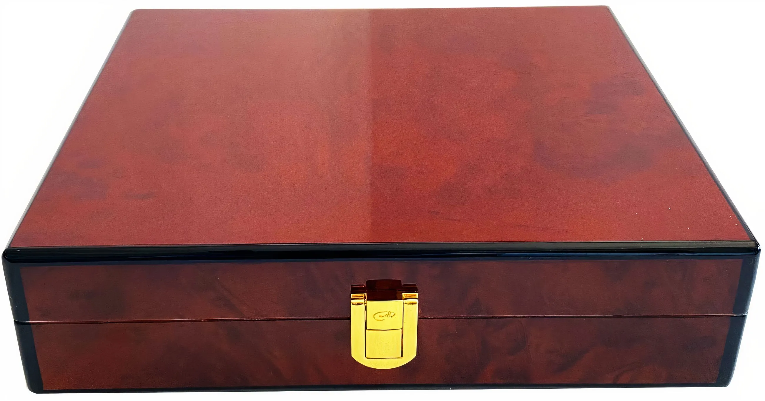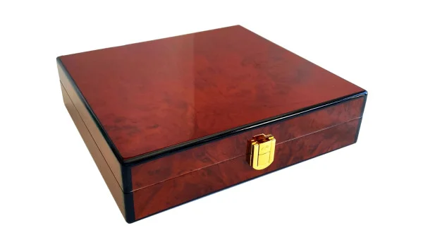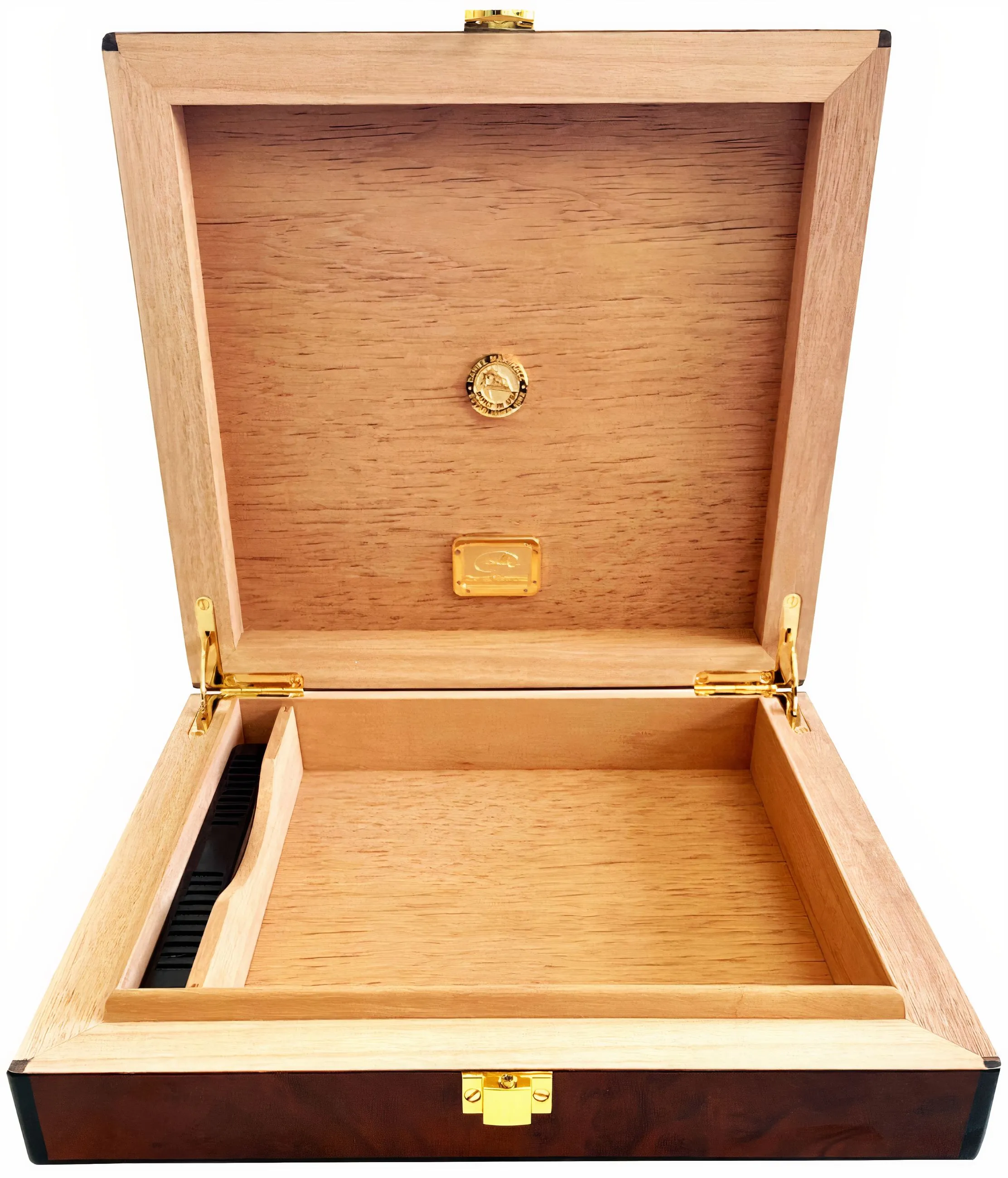 This travel-size humidor features a beautiful brown burl in Daniel Marshall’s trademark 1000-coat lacquer finish, which offers a long-lasting glossy shine. This is further accentuated by black ebony edging for an exquisitely rich look you will be proud to carry wherever your cigar adventures take you. When you are ready for a smoke, the tightly fitting lid opens to reveal 24kt gold plated hinges and a Spanish cedar interior with space for up to 20 of your favorite cigars.