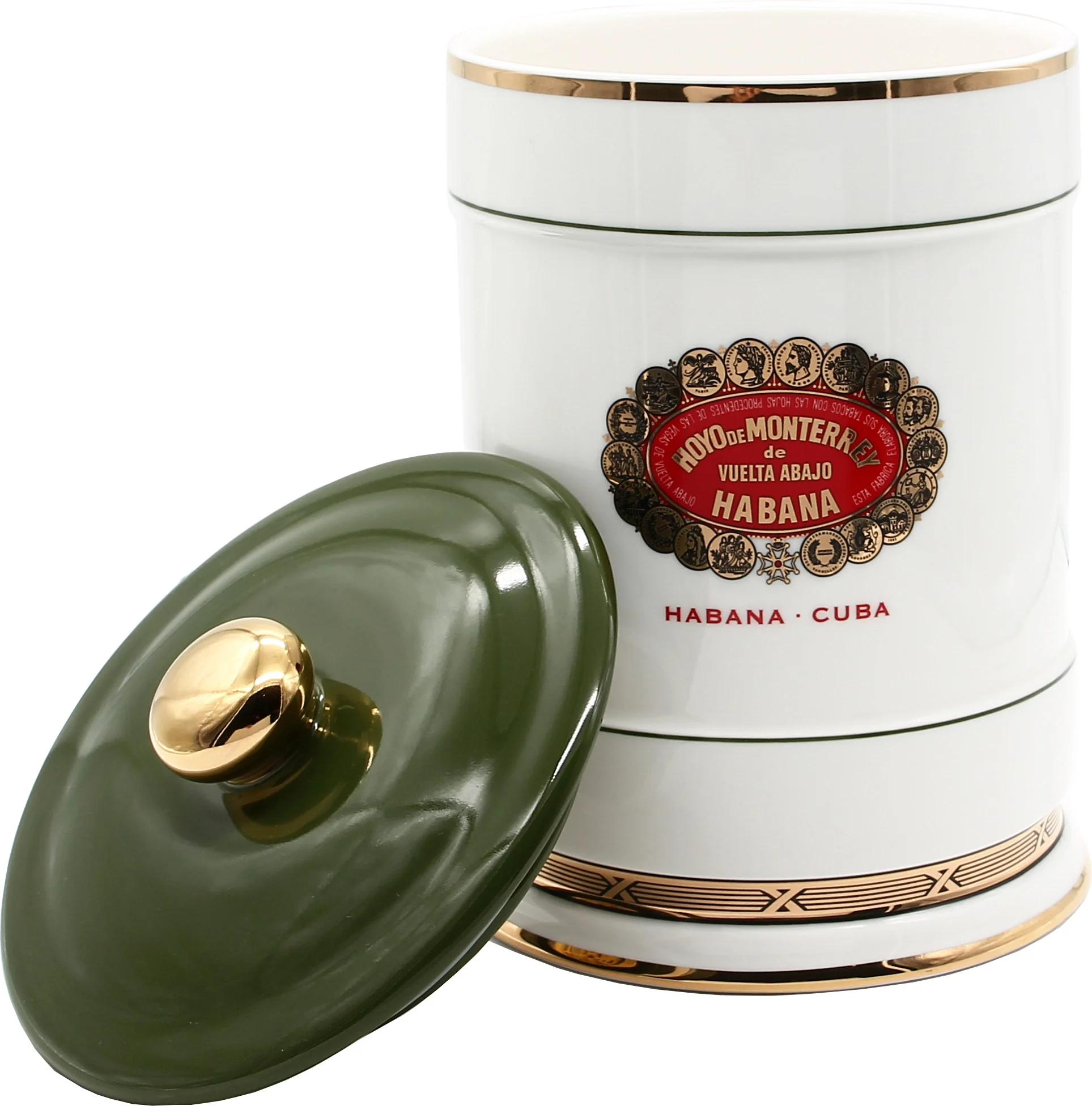 The Hoyo de Monterrey Porcelain Jar is a functional storage container for cigars from the Cuban brand Hoyo de Monterrey. It features white, green, and gold accents, complemented by the Hoyo de Monterrey logo on the front, ensuring brand recognition.