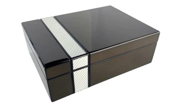 The set begins with a desktop humidor perfectly suited for providing space for up to 25 Corona-size cigars. The two-tone laser finish features contrasting dark and light carbon fiber patterns. A black and silver hygrometer and round humidifier let you better maintain your cigars. Chrome-plated hinges, Spanish cedar interior and divider put the finishing touches on the humidor’s sophisticated design.