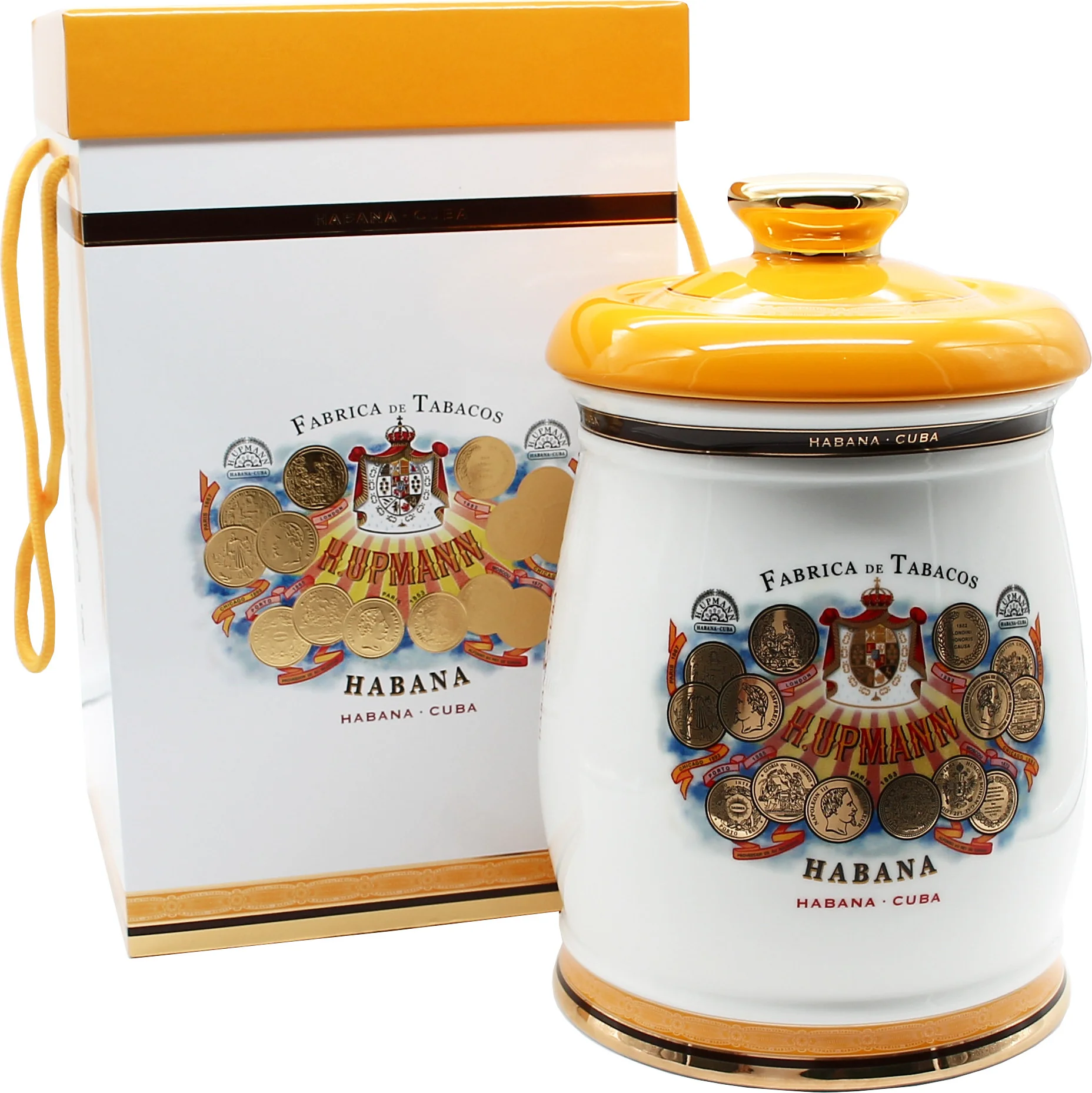 Included is a round sponge humidifier, which attaches magnetically to the lid. The lid itself is equipped with a sealing ring to help maintain a stable internal climate. The jar's design was created by Nelson Alfonos for Habanos S.A. and incorporates the typical lines and color palette of the H. Upmann brand.