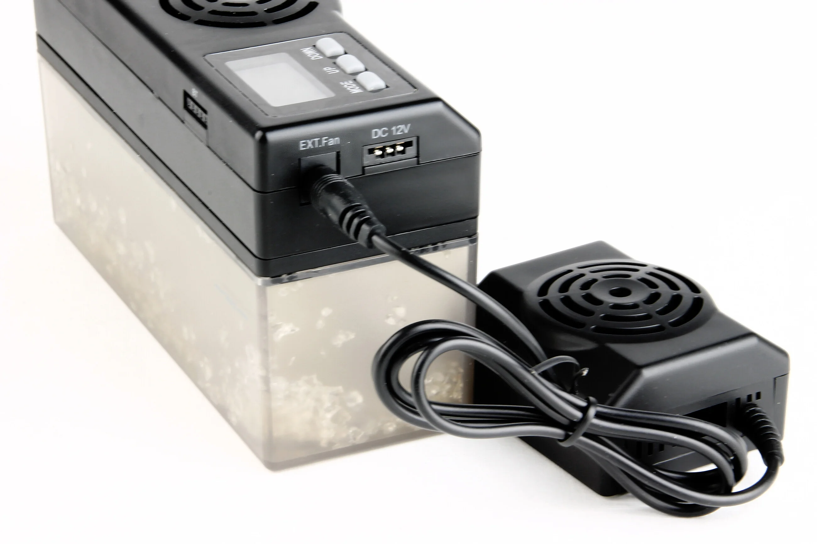 The cable input on the humidifier itself, designated for the external fan, is labeled "EXT Fan." The additional fan can then be placed anywhere inside your own humidor and features a peelable adhesive surface on the back for attachment.