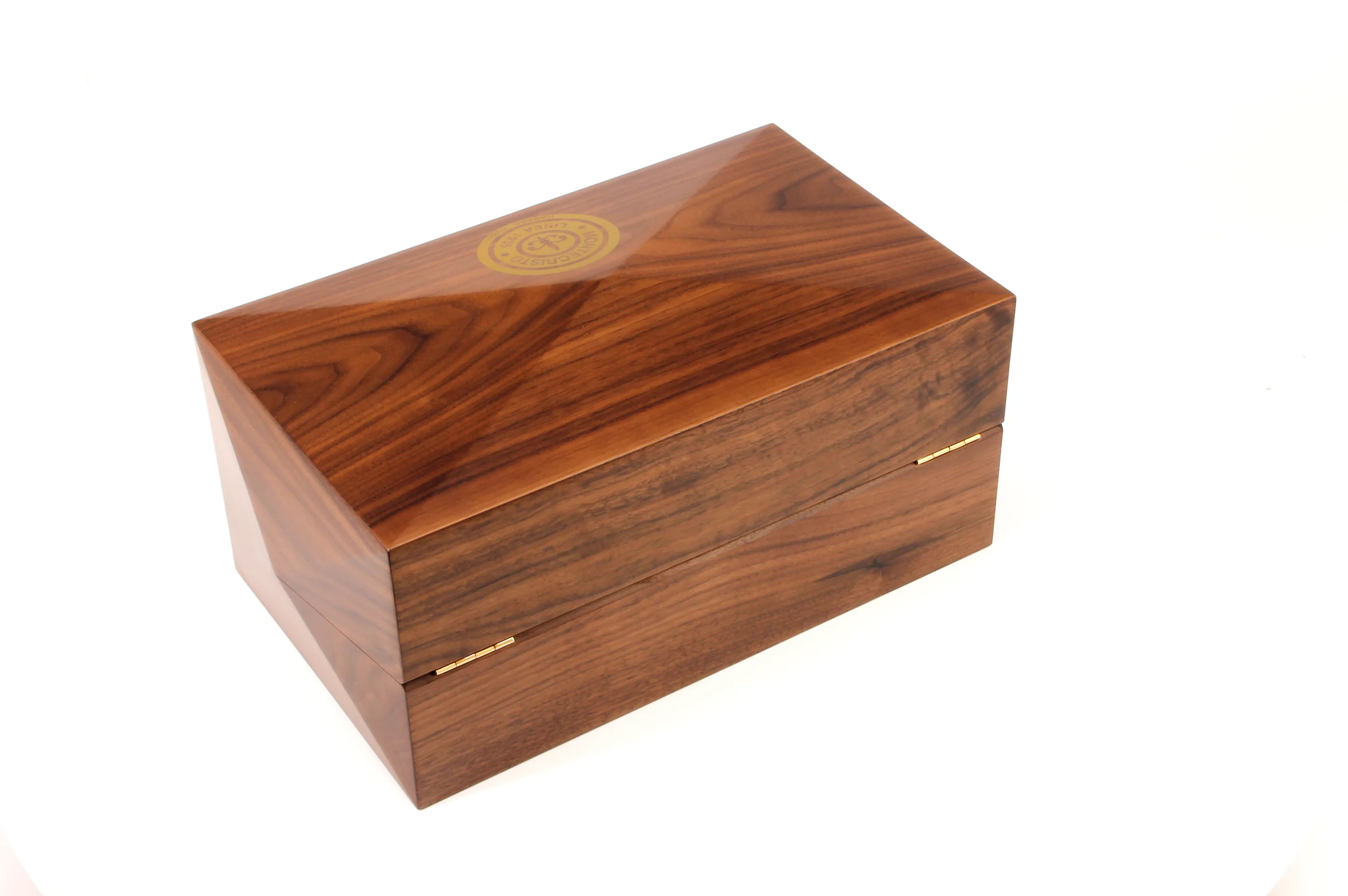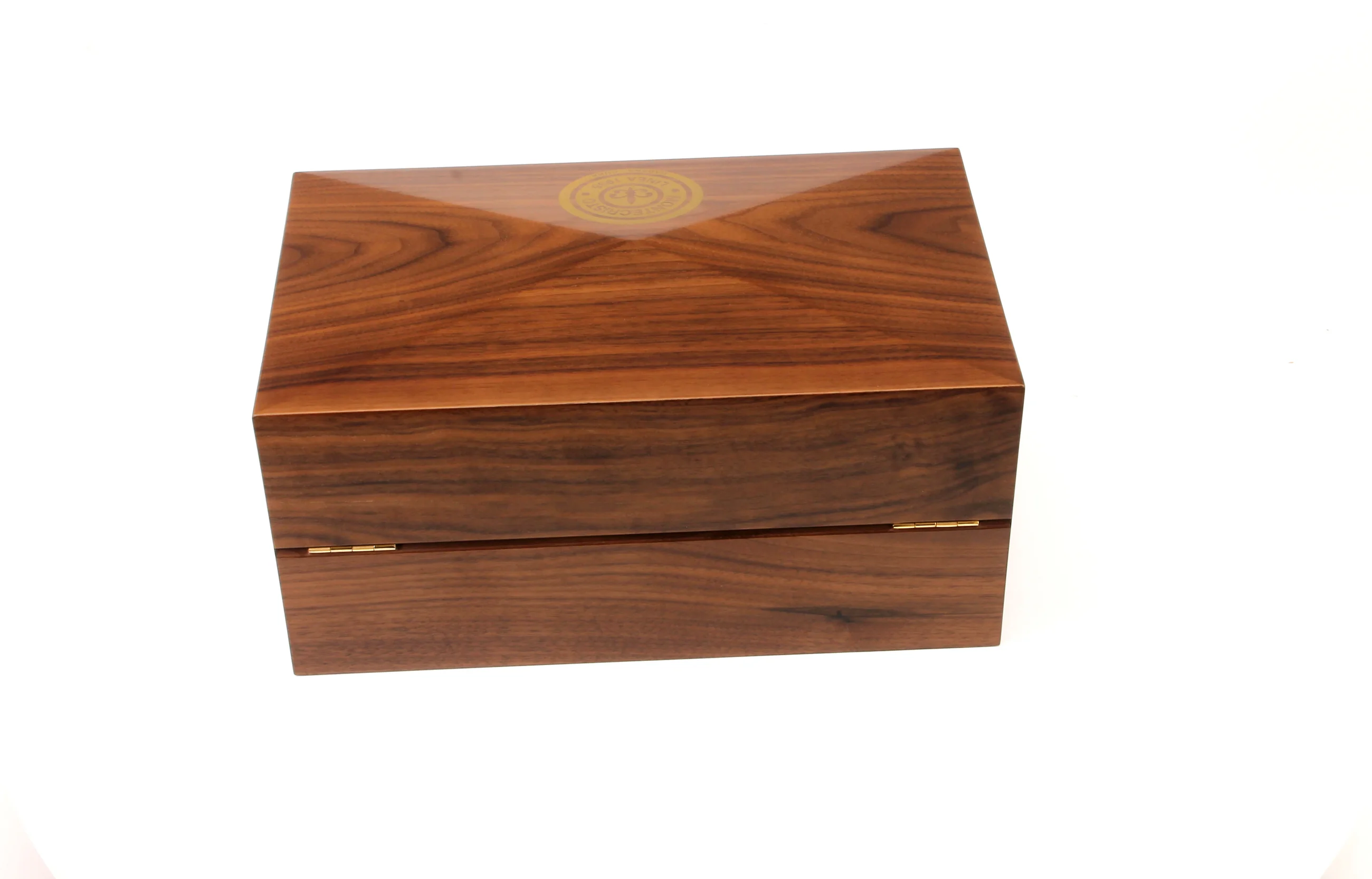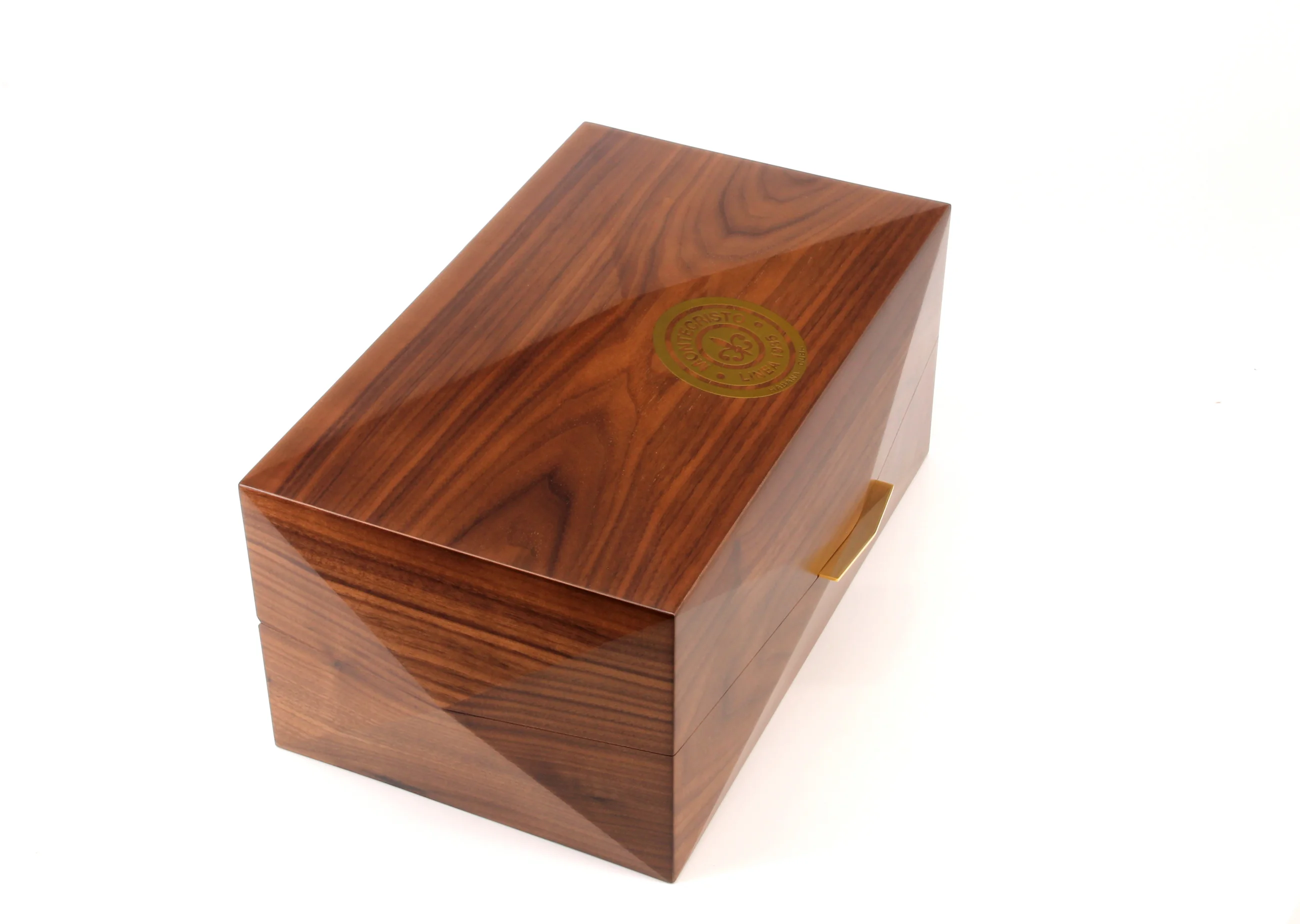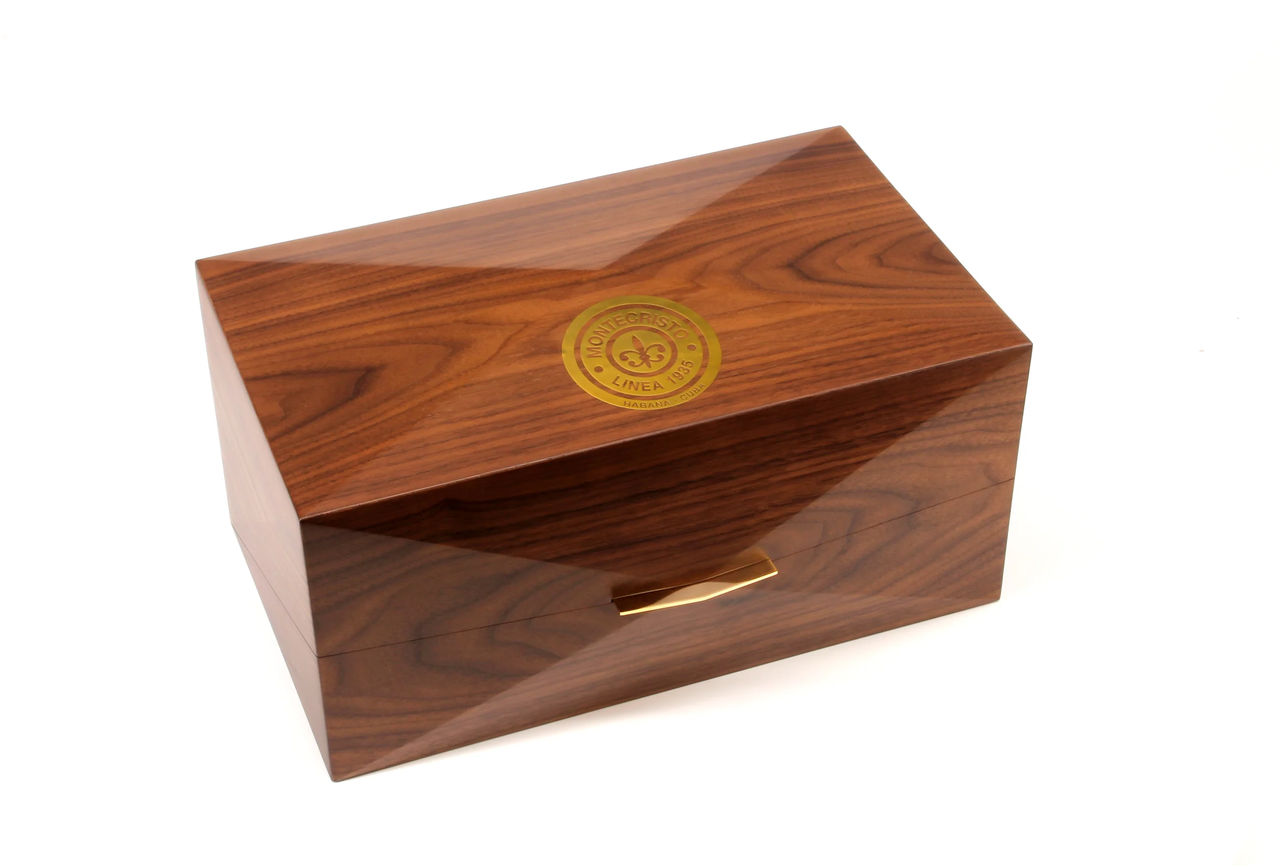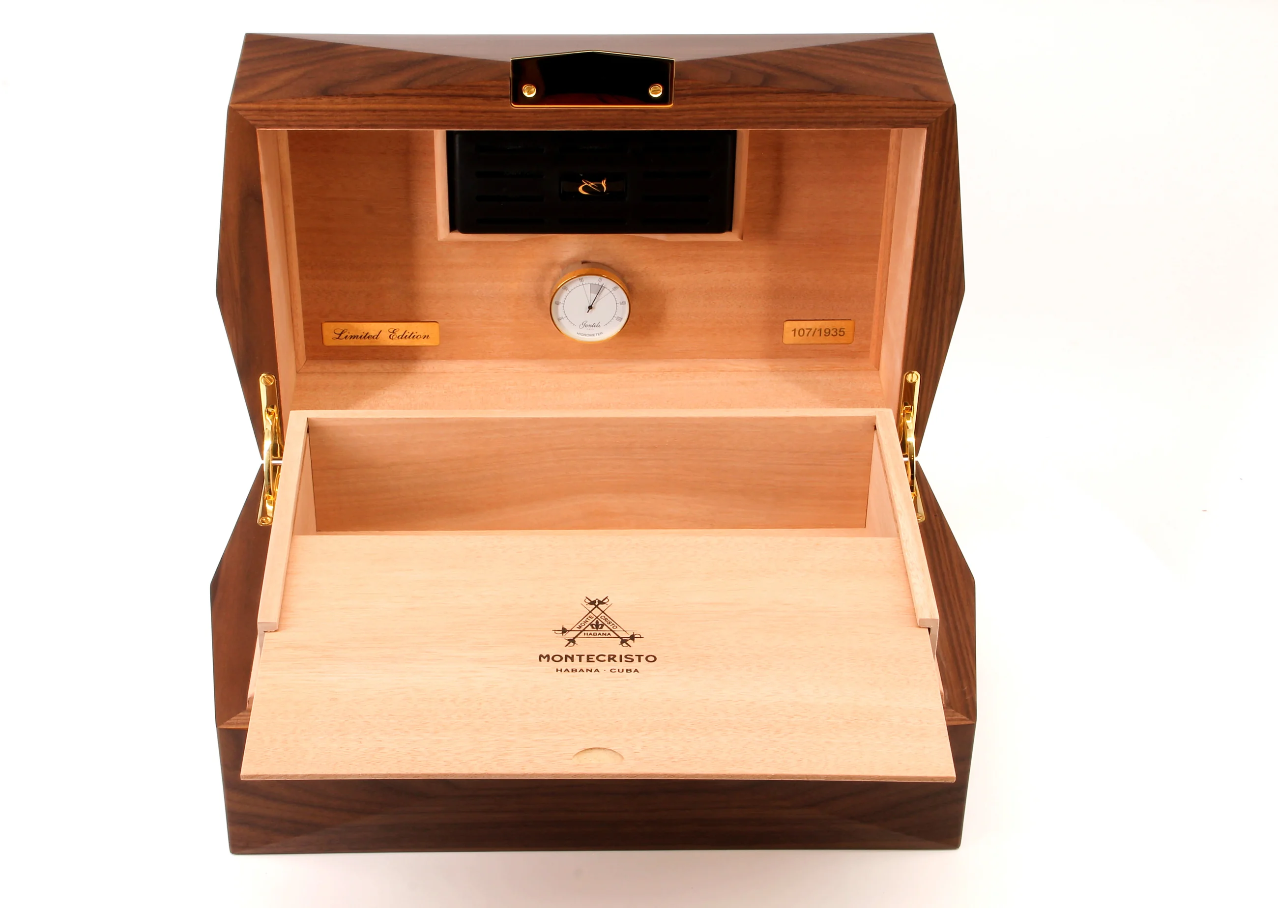 This stunning limited-edition humidor was crafted in Italy of solid cedar wood, making for a sturdy and lasting centerpiece for any room. Each side of the humidor is beveled and decked out in a deep brown finish reminiscent of the Carmelite lacquer of Linea 1935 cigar boxes. A gold-colored round Montecristo logo rests on the top of the lid, which is easily lifted with a gold handle.
