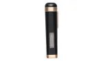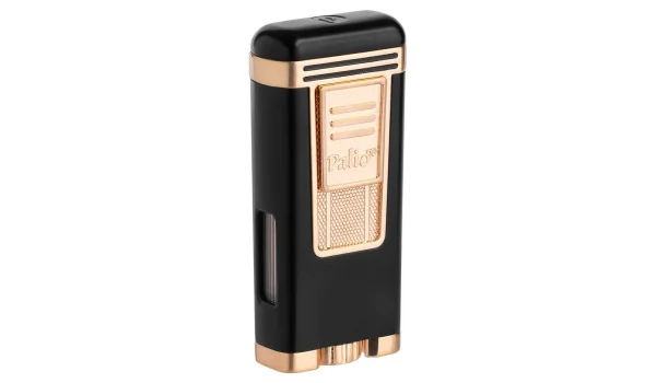 The Palio Polaris Jet Lighter in Black and Rose Gold is a high-performance jet lighter with a sleek matte black finish and elegant rose gold accents. Featuring three powerful jet flames that merge into a reliable burner, this lighter offers consistent ignition for cigar enthusiasts. The ignition is shielded by a protective cap, keeping dust and lint away to ensure long-lasting performance. The Palio logo is prominently displayed on the front ignition switch, which ignites the lighter with a smooth downward slide. A large, transparent gas window on the left side allows for easy monitoring of the fuel level. Naturally, the lighter is refillable, and the flame intensity can be conveniently adjusted by hand at the base of the lighter without additional tools.