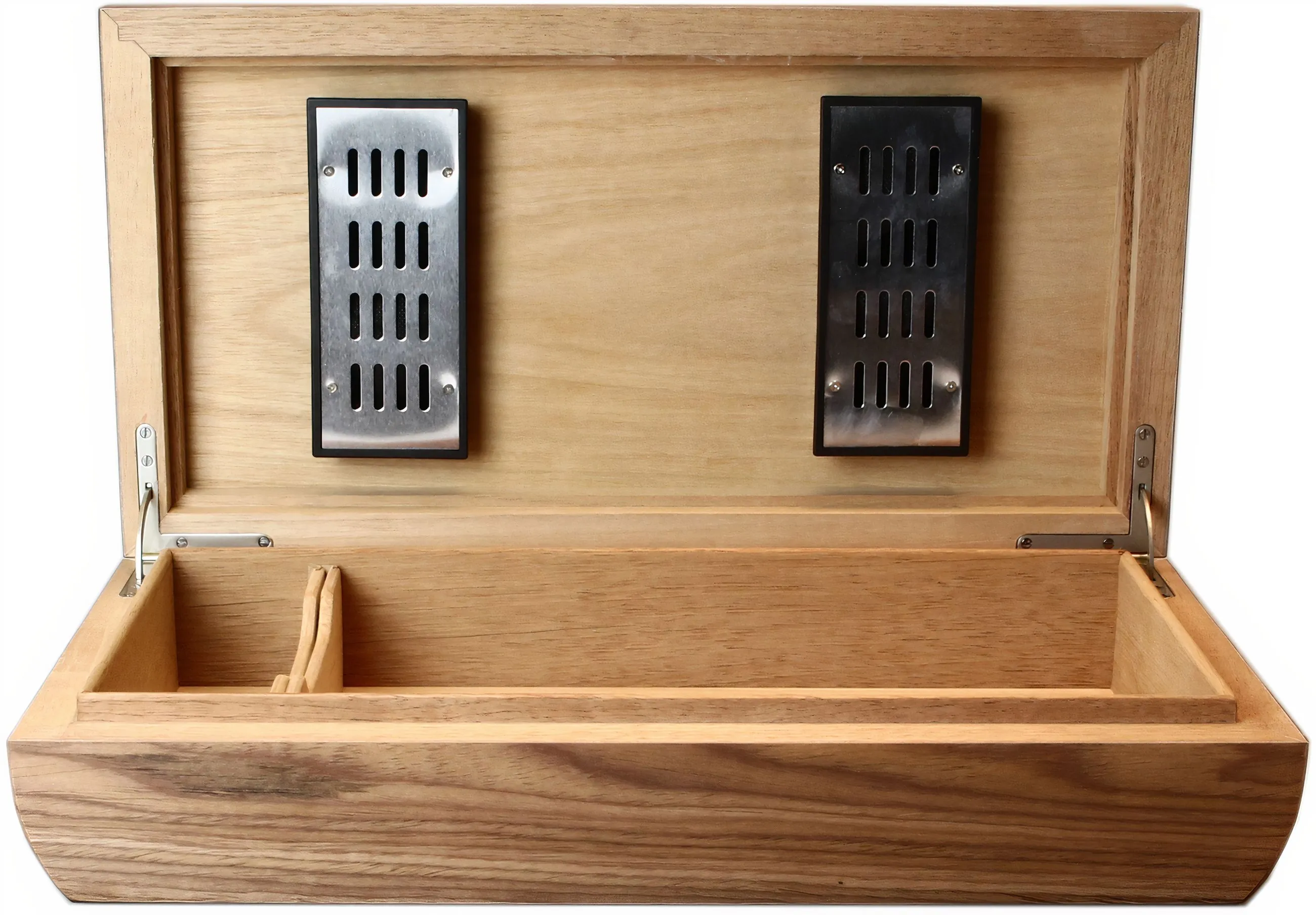 Sturdy premium quality hinges open the lid with a smooth and easy motion to reveal a cedarwood interior space ready to hold up to 80 of your favorite Corona-size cigars. You can separate cigars with the included divider, while cigars are preserved at the optimal humidity with two self-regulating acryl polymer humidifiers. There’s no need for a hygrometer, just add distilled water when needed, and that is it.