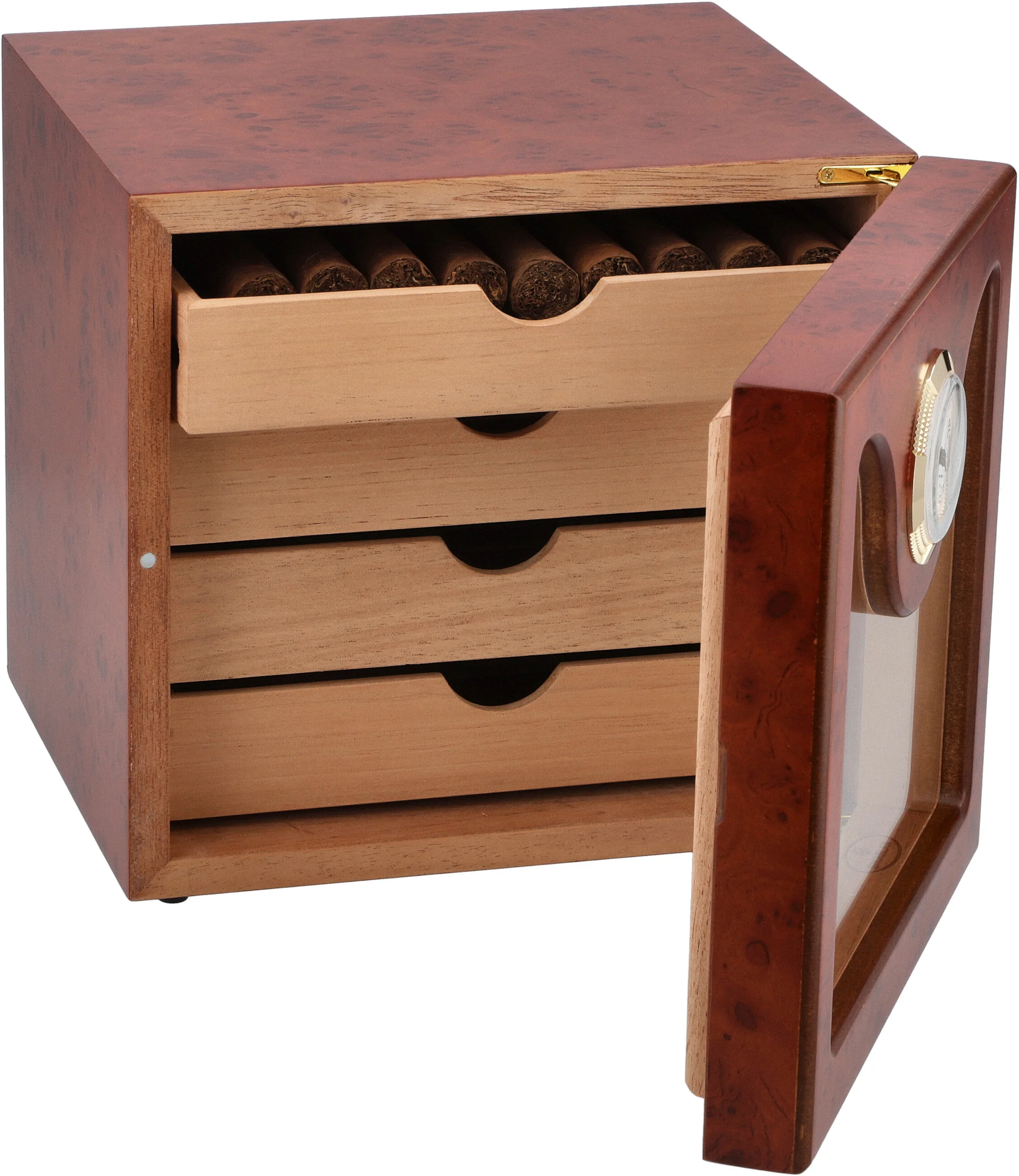 Noble table humidor in cube shape with a capacity of approx. 50 cigars With 4 drawers, hygrometer and humidifier Hygrometer permanently installed and can be read from the outside