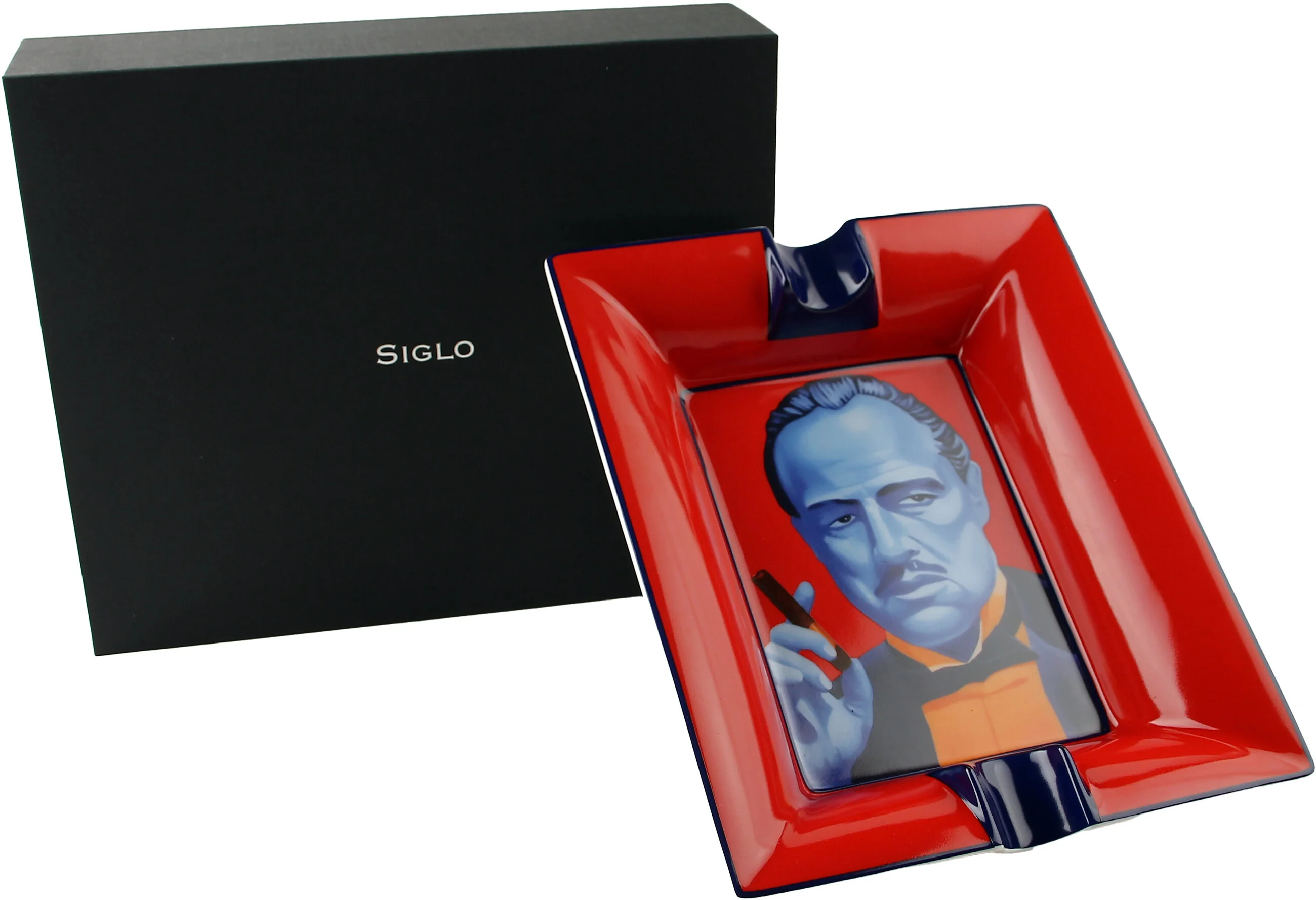The Siglo Marlon Brando Ashtray is a bold cigar ashtray in striking red and blue, featuring an iconic image of Marlon Brando holding a cigar with unmistakable enjoyment. Known for his passion for cigars, Brando embodies the art of savoring a moment of relaxation. This ashtray is a true statement piece that draws attention wherever it is placed.