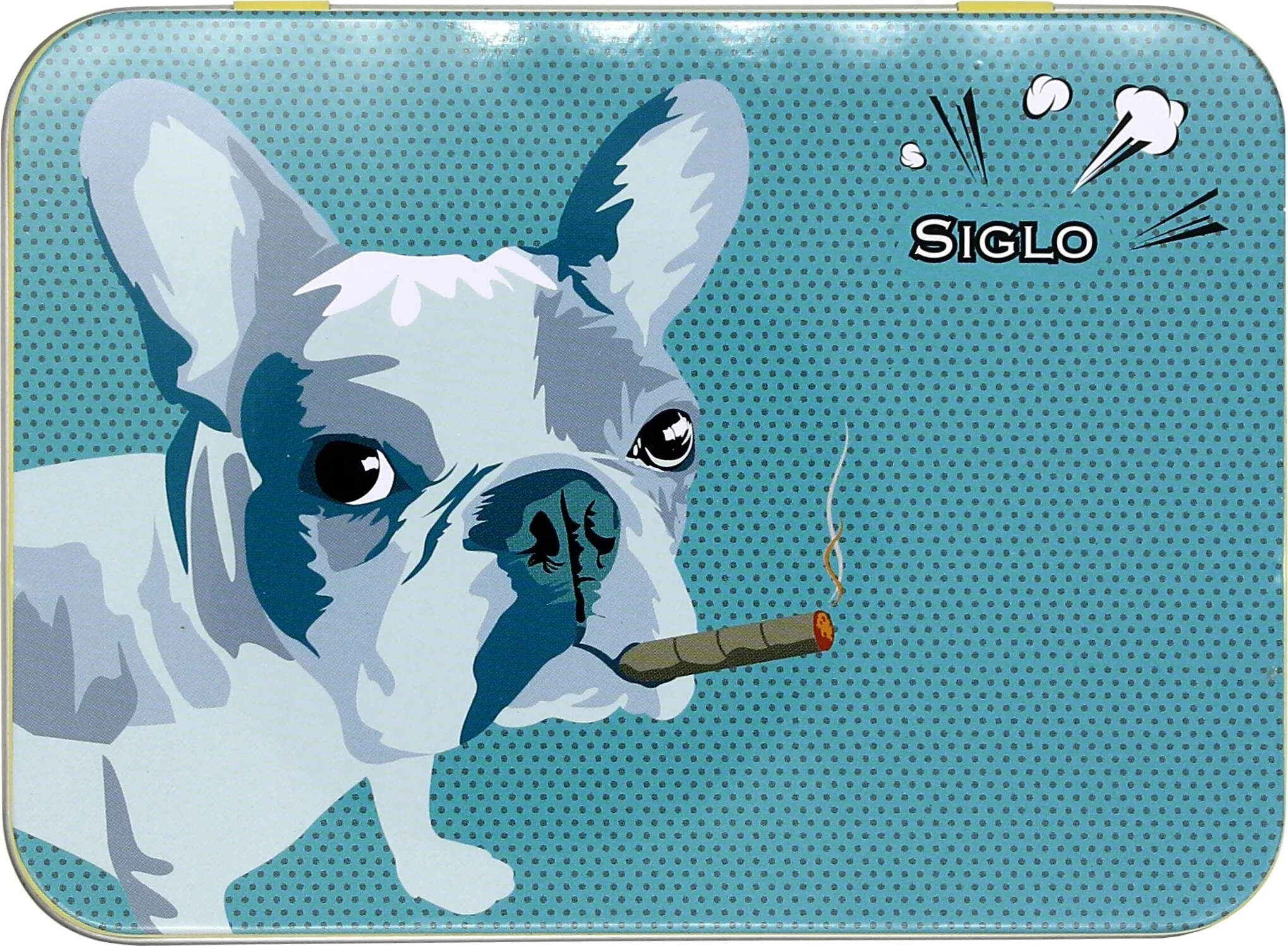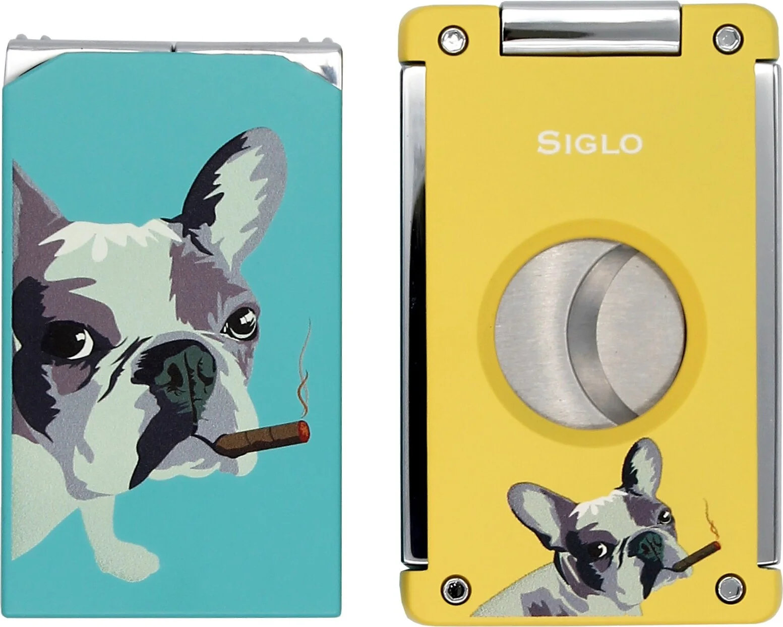The Siglo Dog Lighter and Cigar Cutter Set is a striking and creatively designed duo for cigar lovers. Both accessories feature a smoking French Bulldog in pop art style. The backs echo the motif with a typical polka dot pattern, emphasizing the artistic character of the design. The set immediately catches the eye and adds a modern, humorous touch to any cigar collection.