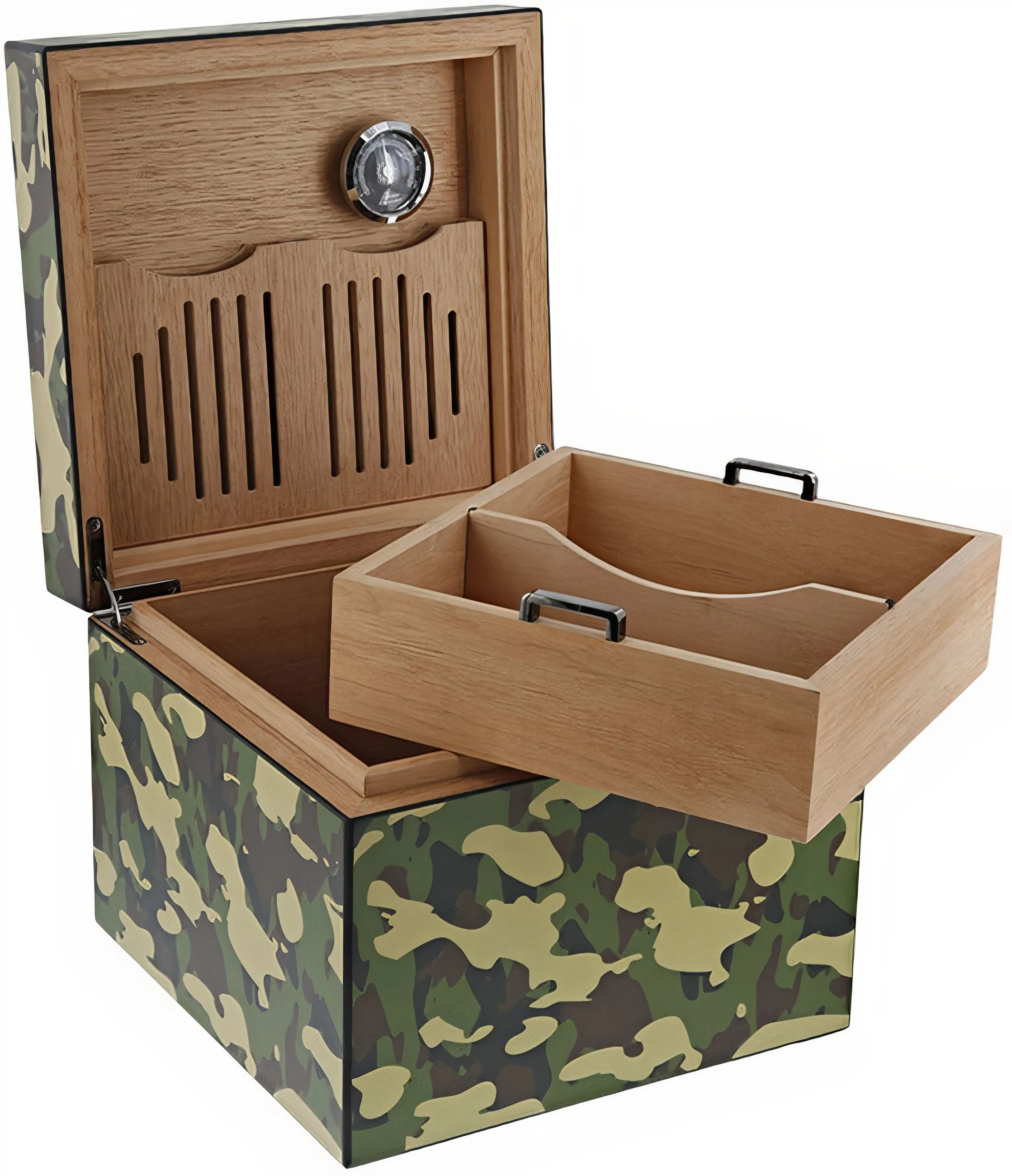 - Modern cube humidor with a striking camouflage pattern and subtly printed S.T. Dupont lettering on the front of the lid.