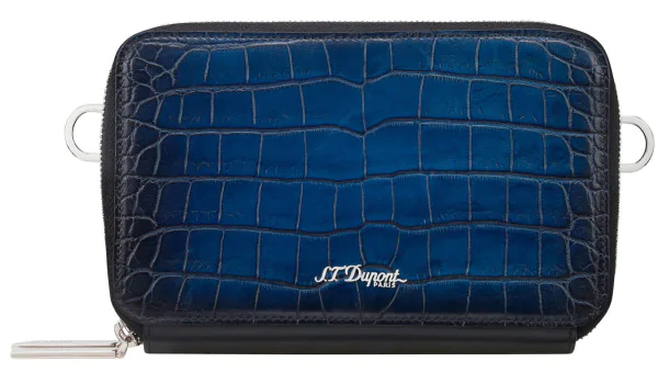 The S.T. Dupont Le Grand Atelier Cigar Crossbody Bag in blue is a stylish accessory for cigar smokers. Made from calf leather embossed with a crocodile pattern, this small shoulder bag offers an elegant and practical solution for transporting your cigars and accessories. The bag is ideal for carrying a 3-cigar case from S.T. Dupont along with related accessories.