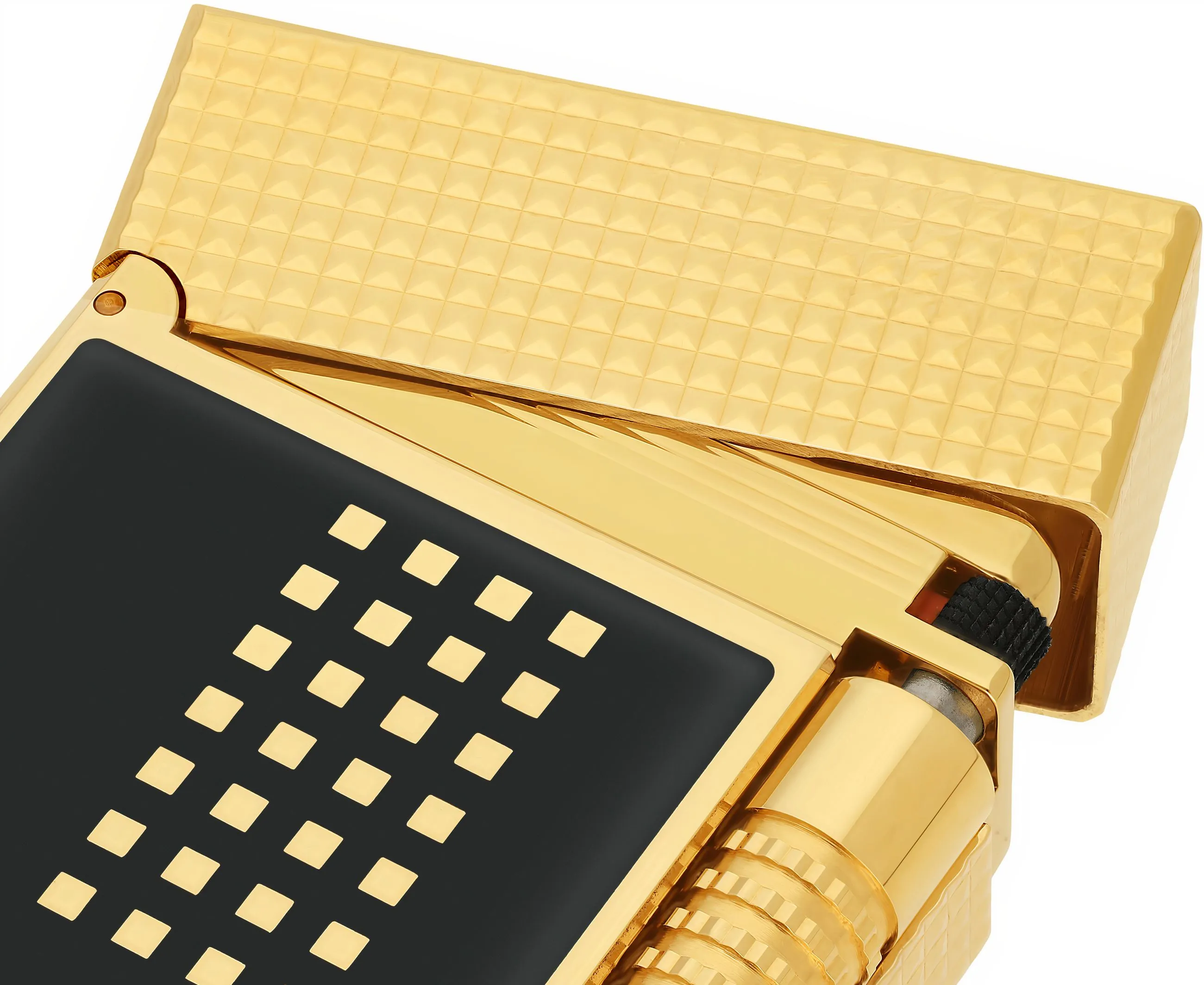 The combination of matte black surface and yellow-gold accents gives the lighter a sophisticated, modern look. It is refillable, the flame height is adjustable, and the ignition is based on replaceable flints.
