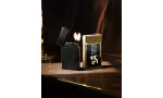 The completely matte black finish gives the lighter a modern, elegant appearance. It is refillable, and the flame intensity can be conveniently adjusted using the dial on the base. The reliable stone ignition ensures longevity, and the flints can be easily replaced.