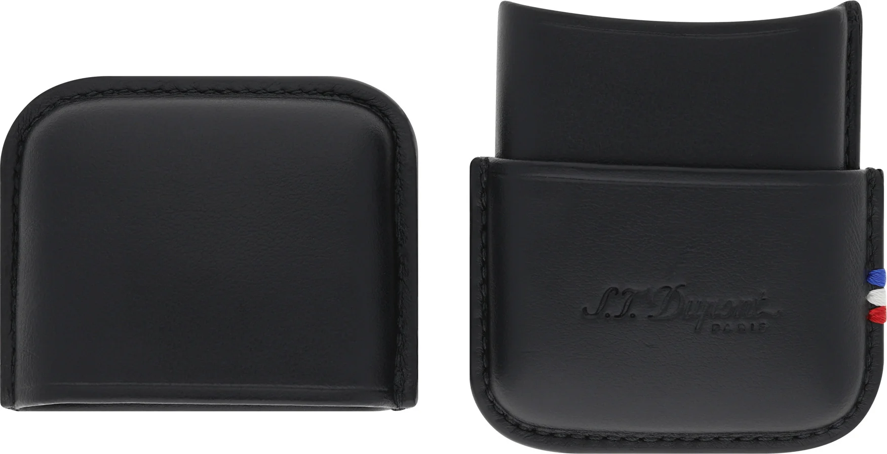 The S.T. Dupont Line 2 lighter case in black is an elegant and robust genuine leather case for your valuable Ligne 2 lighter from the French luxury brand S.T. Dupont. Ligne 2 lighters from Dupont are typically passed down through generations. All the better if you protect it permanently from external influences such as drops or scratches. This two-piece case was made in Spain from the finest smooth cowhide leather. The "Made in Spain" imprint can be seen on the inside of the top section. A beautiful decorative seam forms the outer frame of the lighter case, further enhanced with the brand's signature blue, white, and red stitching, signifying its French origin. The brand name is embossed on the front of the lower section of the case. The dimensions are approximately 8 x 5.5 x 2 cm. The product comes in elegant packaging, making it the ideal gift for owners of the Ligne 2 model. A protective cleaning cloth and the manufacturer's warranty card are included.