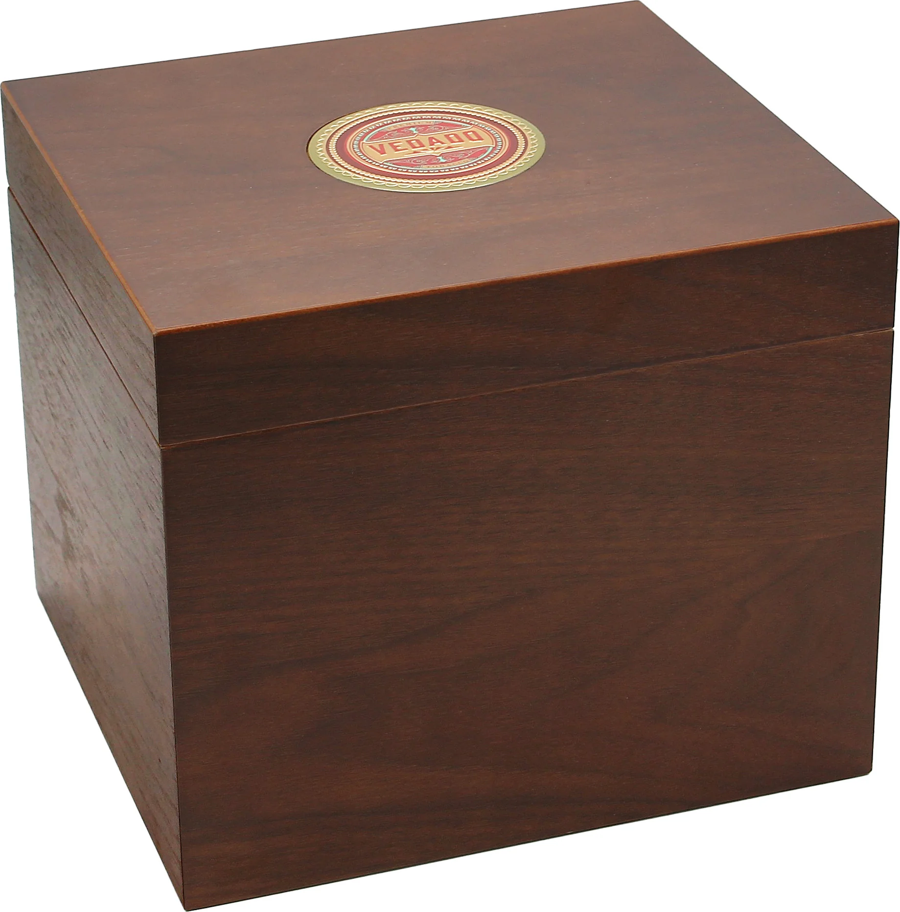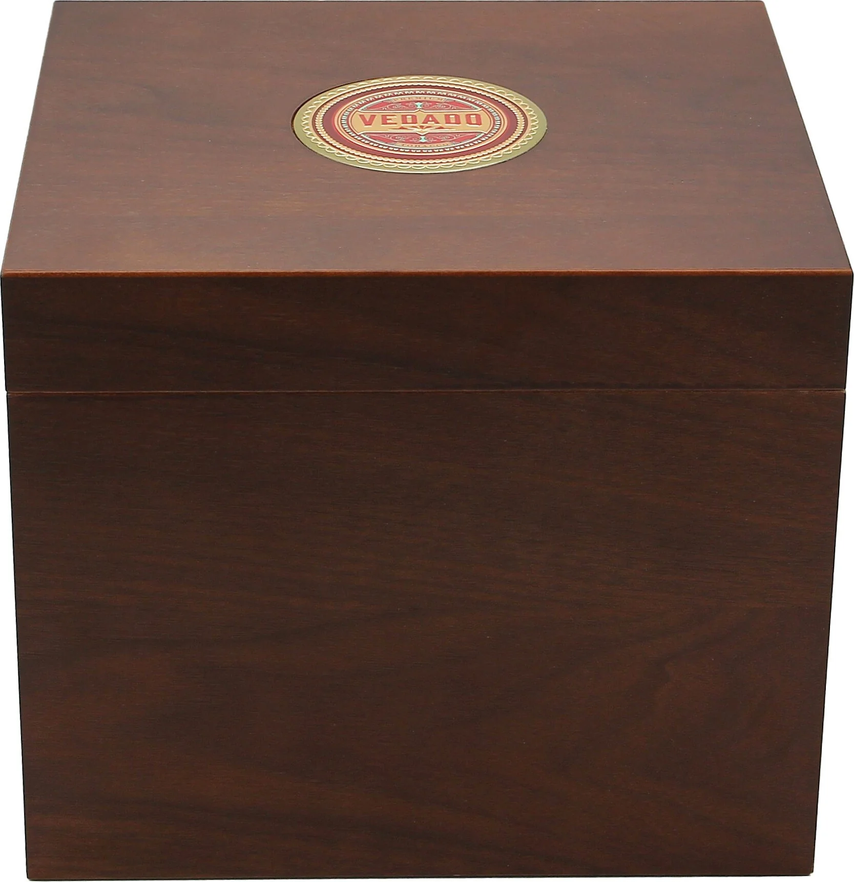 The Vedado Humidor impresses with its elegant design and high-quality workmanship. Its warm brown-red tones lend it a classic elegance, while the inlaid Vedado plaque on the lid, with its raised texture, provides a unique detail.