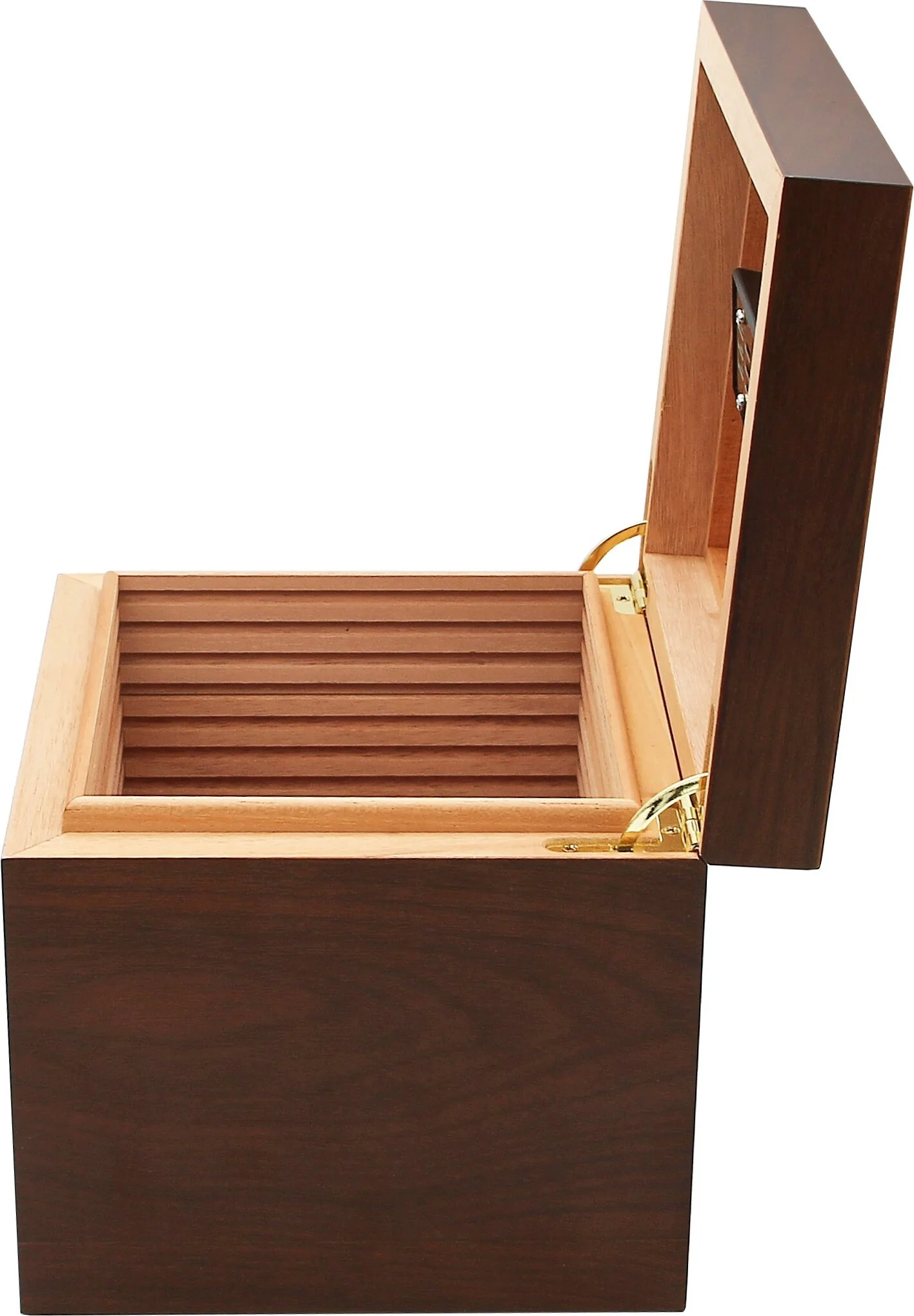 A hygrometer for reading the humidity level is not included, but the humidor can easily be retrofitted with a separately available hygrometer.
