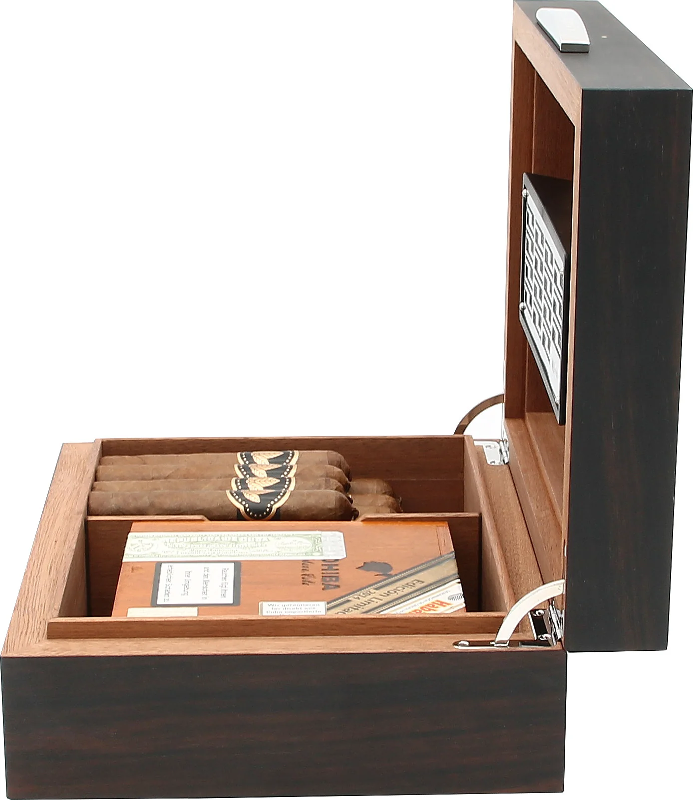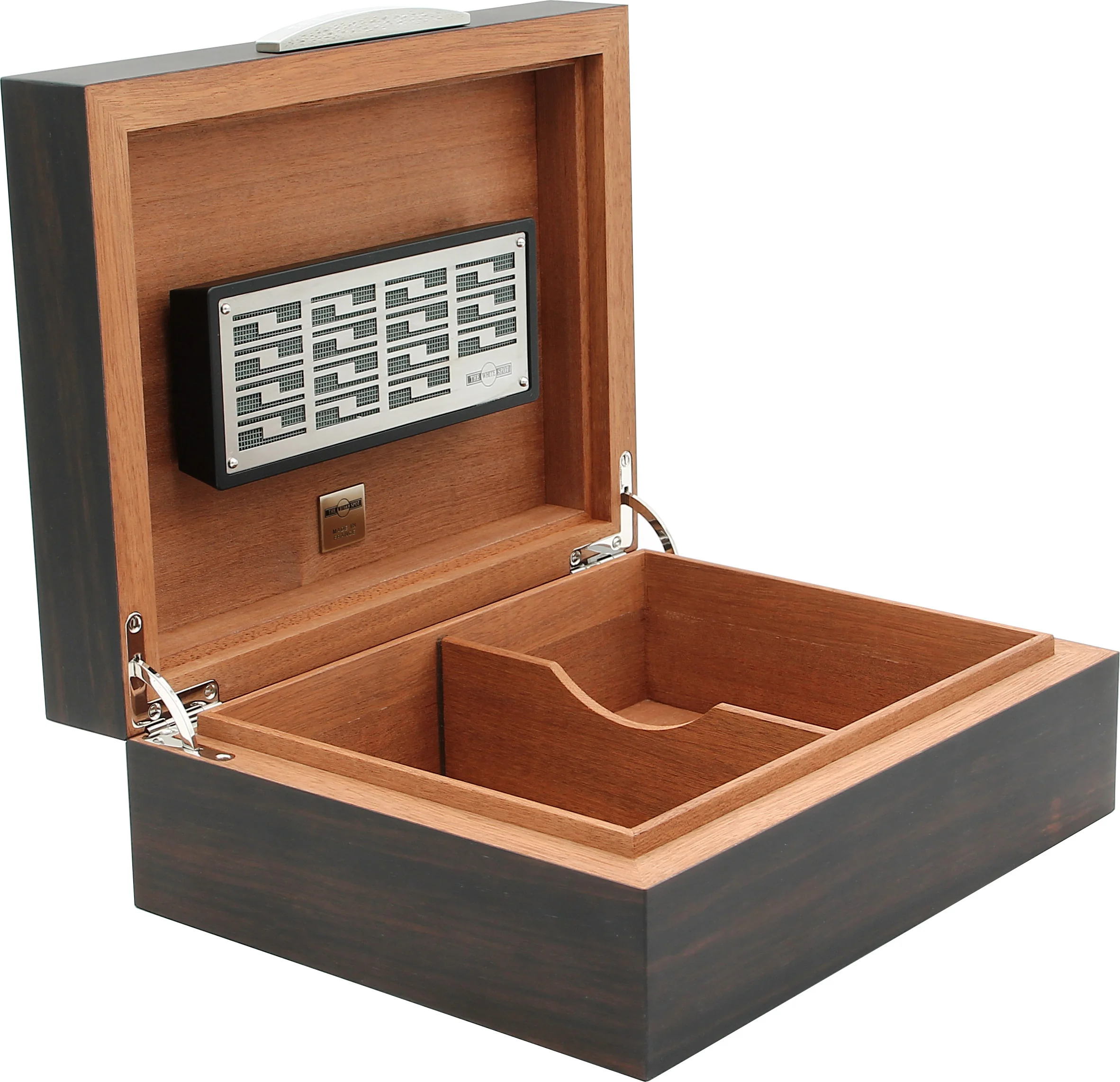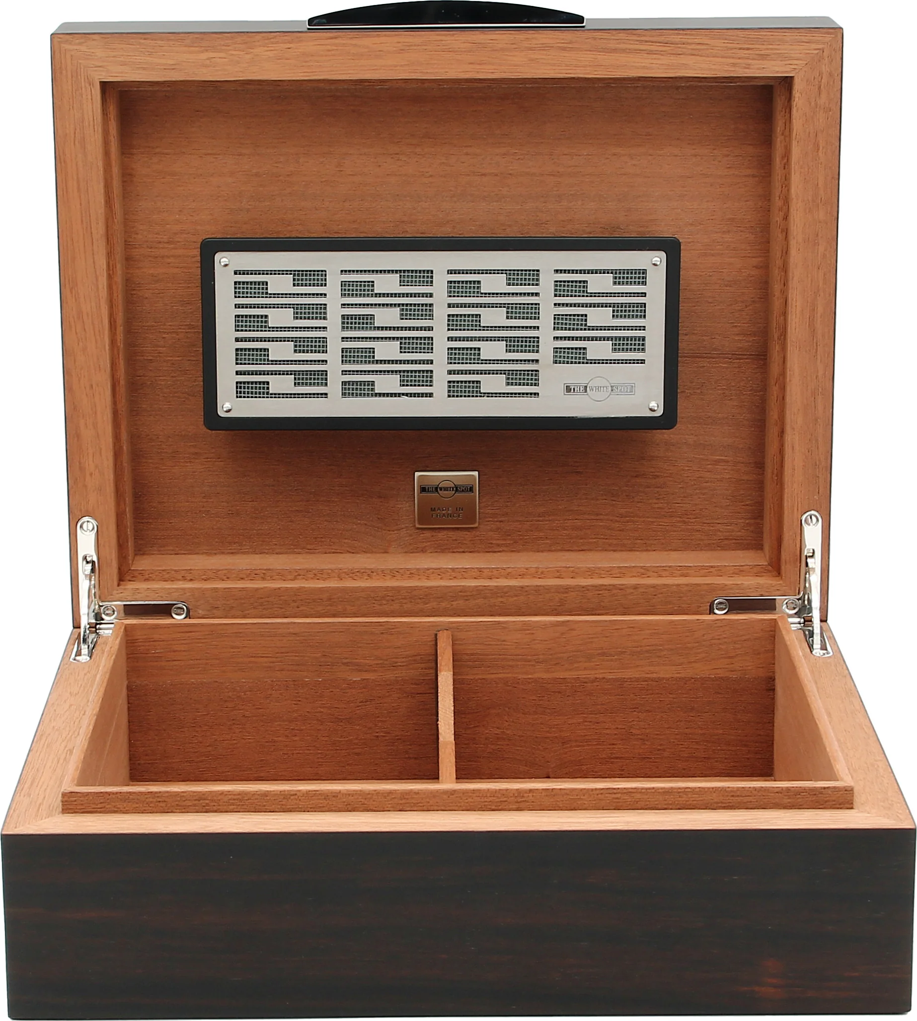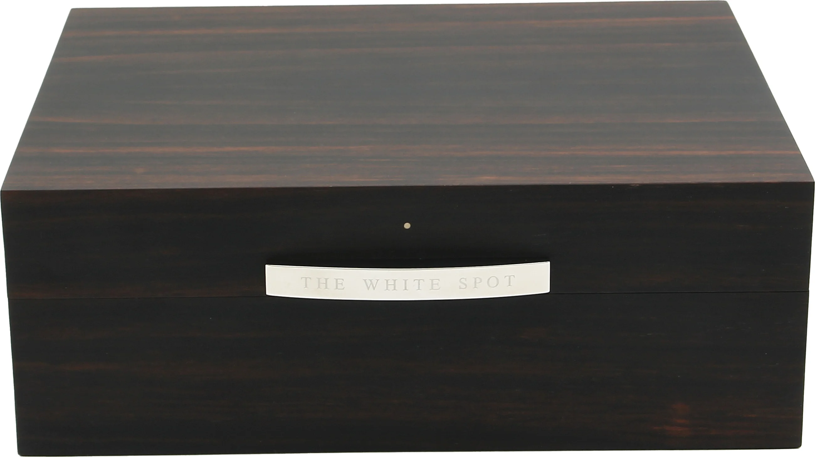 The White Spot by Dunhill Humidor is a fine humidor from the traditional English brand Dunhill, crafted from high-quality Makassar wood veneer in an elegant dark brown color with a fine, subtle grain. This humidor embodies classic elegance and the highest craftsmanship, a gem for discerning cigar lovers.