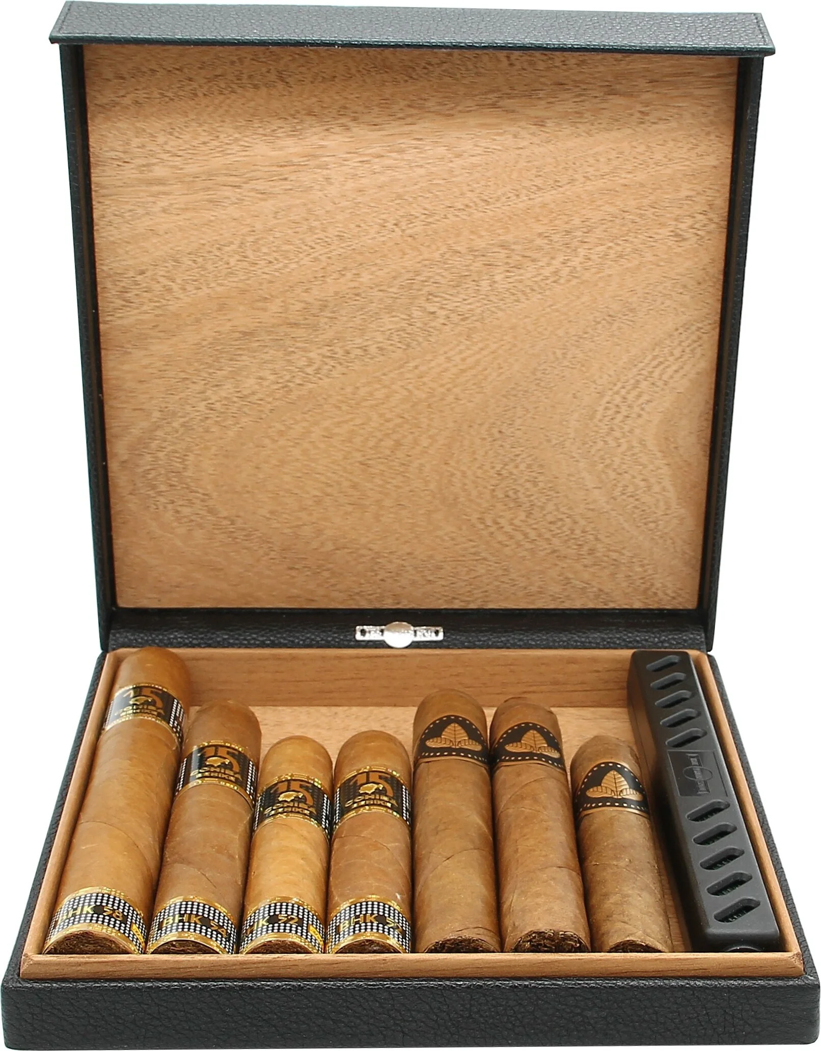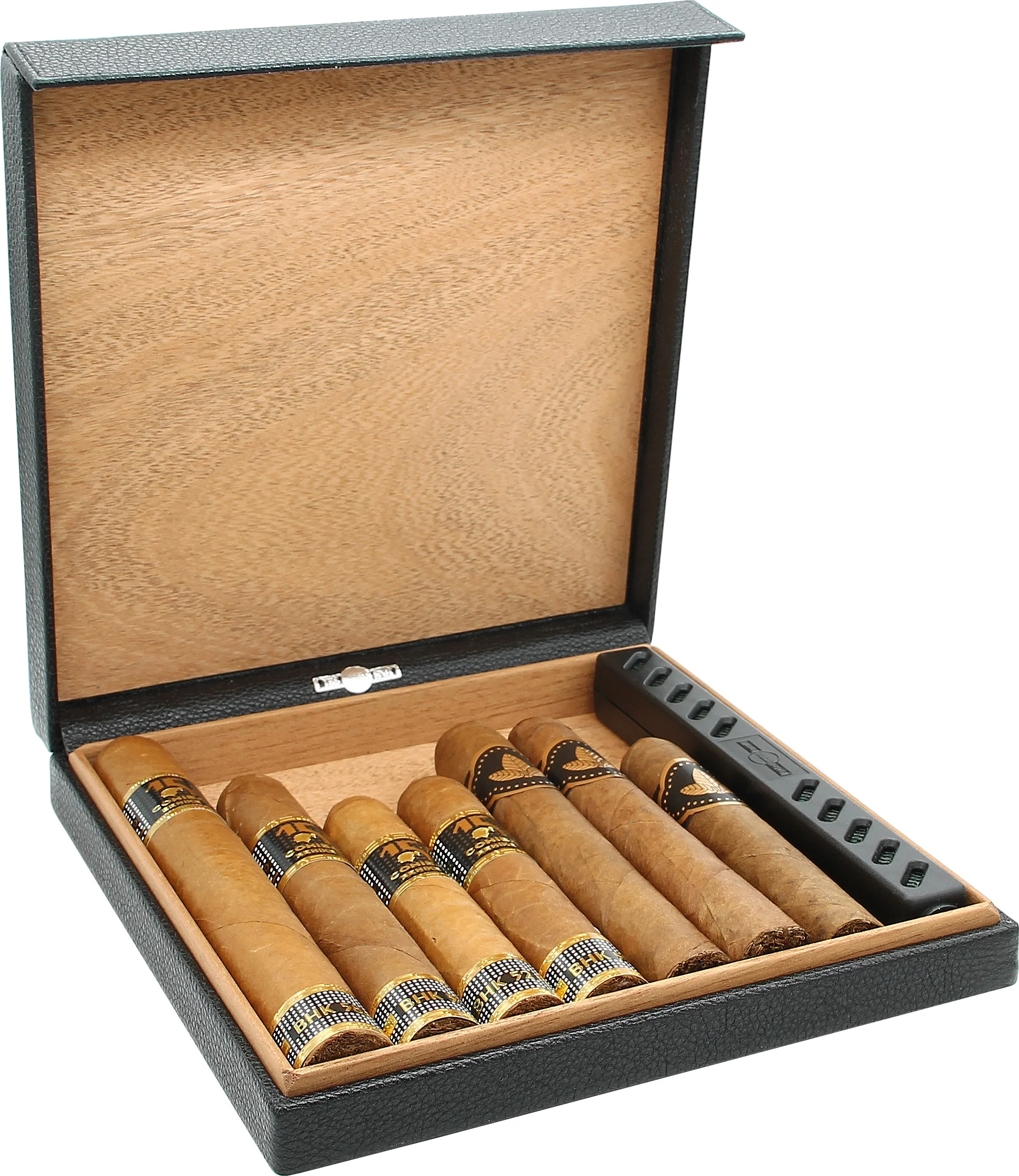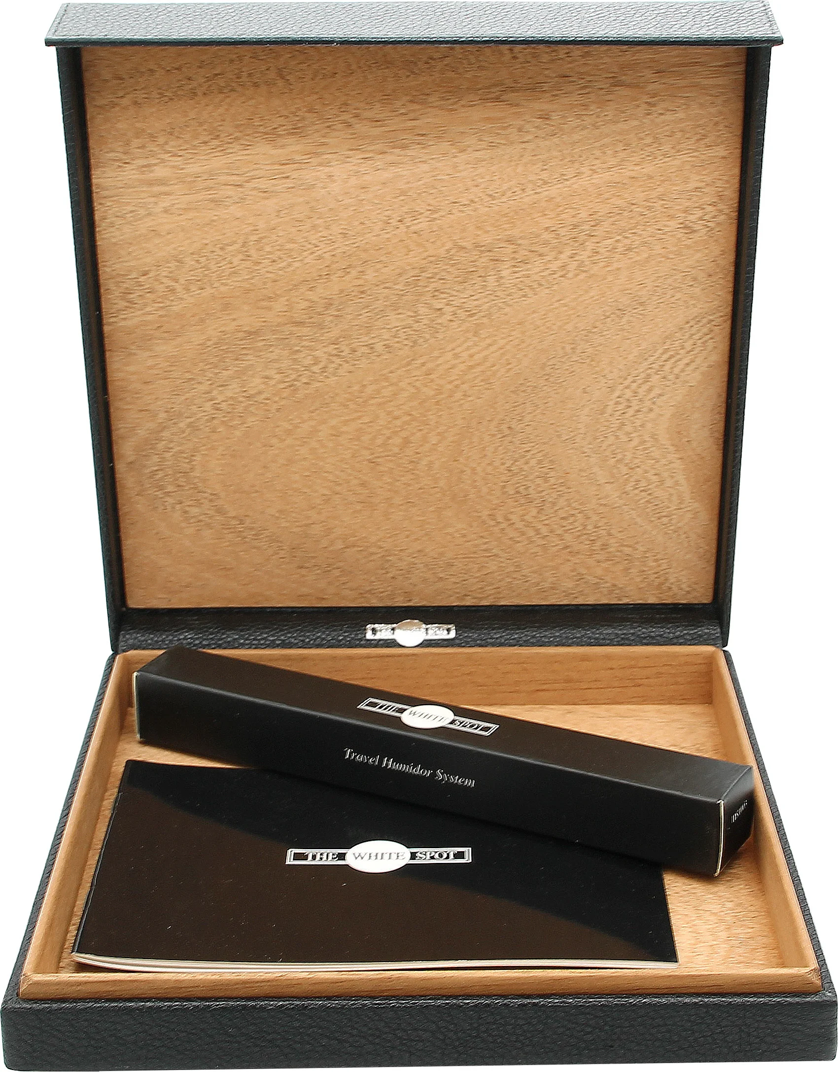 This elegant travel humidor in black from the renowned English heritage brand Dunhill is the perfect companion for travelling. Covered in the finest grained leather from Spain and lined with high-quality wood, it offers space and protection for approximately 10 cigars. The closure is a magnetic clasp hidden beneath the leather. The White Spot symbol embossed into the leather is an unmistakable Dunhill trademark. A sophisticated travel humidor that stylishly protects your cigars and proves to be a reliable companion on all your travels and trips.