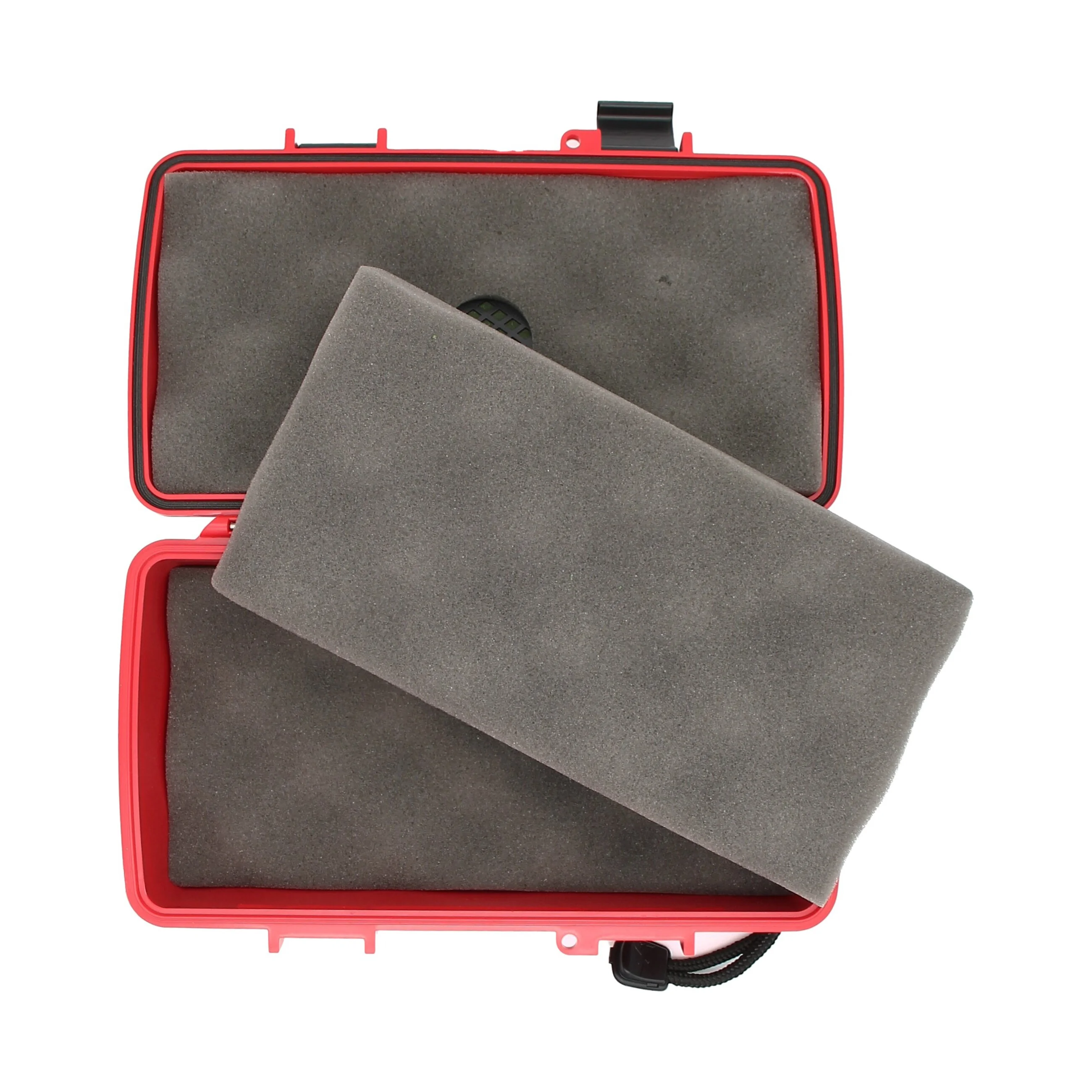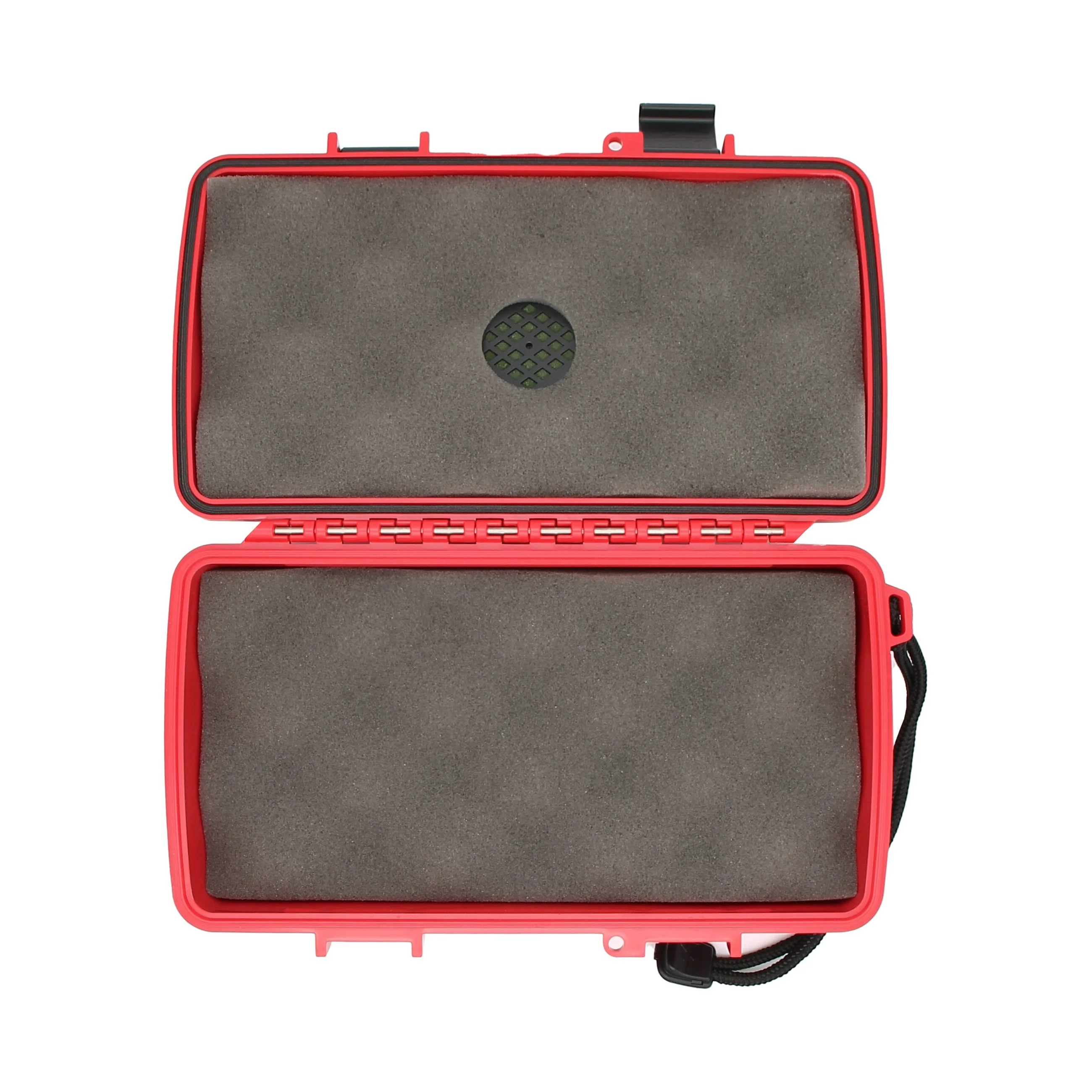 This classic travel humidor, shown here in a striking red, is made of shatterproof ABS plastic, so you don't have to worry about damage to the contents. The stainless steel hinges and sturdy latches ensure a perfect airtight and watertight seal. A locking ring allows you to attach a padlock, so you can be sure that you're the only one who opens your treasure chest.